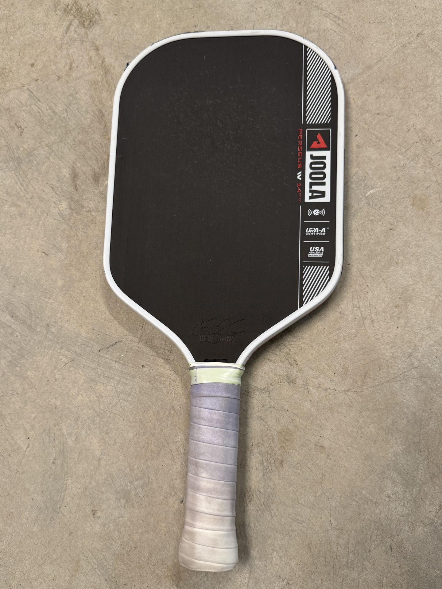 * Selling a Joola Perseus Pro IV 14 mm paddle, currently weighted at 8.3 oz with lead tape for added stability and plow-through. * Condition: Very good. Lightly scratched faces, tight edgeguard, no cracks or dead spots. It was my spare. Used it for 2 tournament, good as new. I always had overgrip on and protective tape, you can replace them yourself. * This is a top tier paddle known for its hard hitting power, ideal for intermediate to advanced players looking for a solid feel. * Lead tape can be removed or adjusted based on your play style.