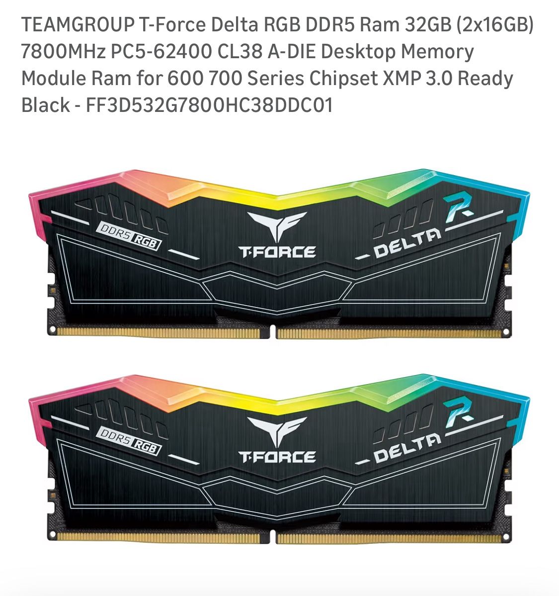 32 GB DDR5 TeamGroup RGB T-Force Delta (16 GB x 2) CL38 A-die 7800 MHz