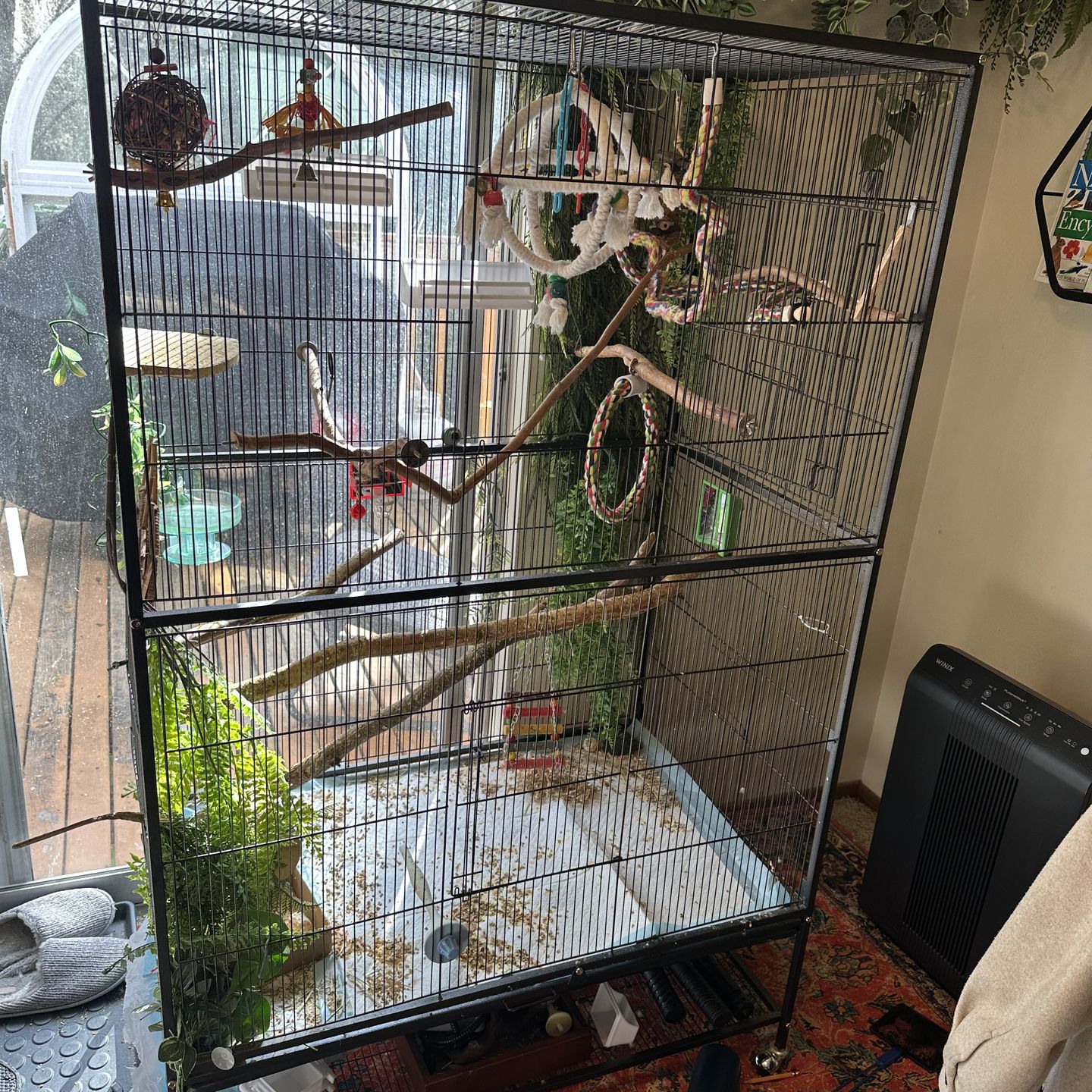 I have a large bird cage with a bunch of fake plants, toys, sticks, heaters, etc. I have more than what’s pictured, a whole tote full of bird toys and sticks, tent, bird bath, food dishes, playground for free flying, etc. I rehomed my budgies after my cat attacked one of the flock members. I am no longer going to own birds and am ready to rehome all the gear needed have your own happy, stimulated bird(s). Cage has removal bottom and easy clean tray, though I just put puppy pads over the bottom for easy weekly cleaning. I have extra puppy pads as well, about 50. Priced to sell.