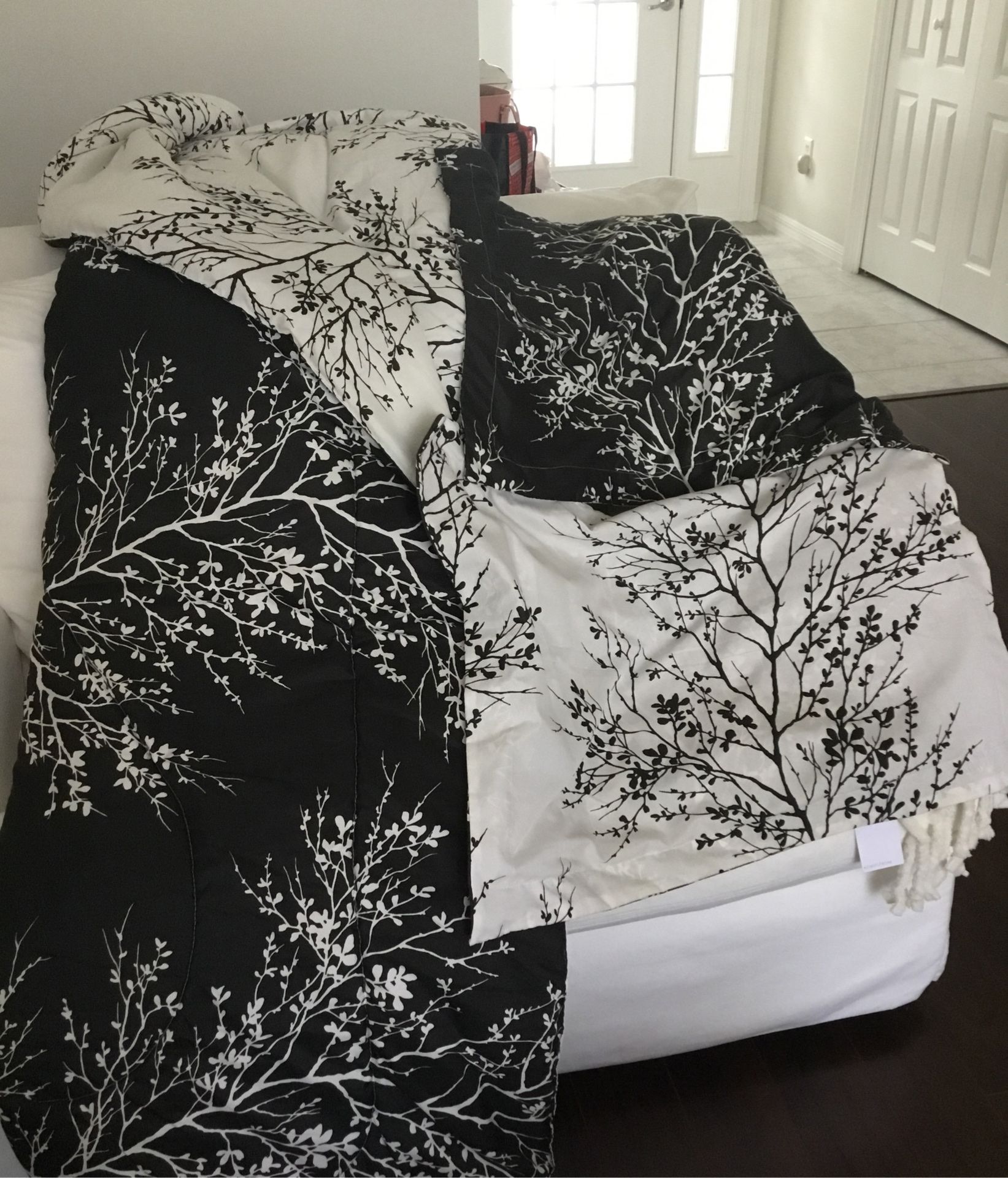 Queen size comforter and two pillow shams and 1 euro sham. This completely reversible- almost two sets in one. Black and white/ cream color