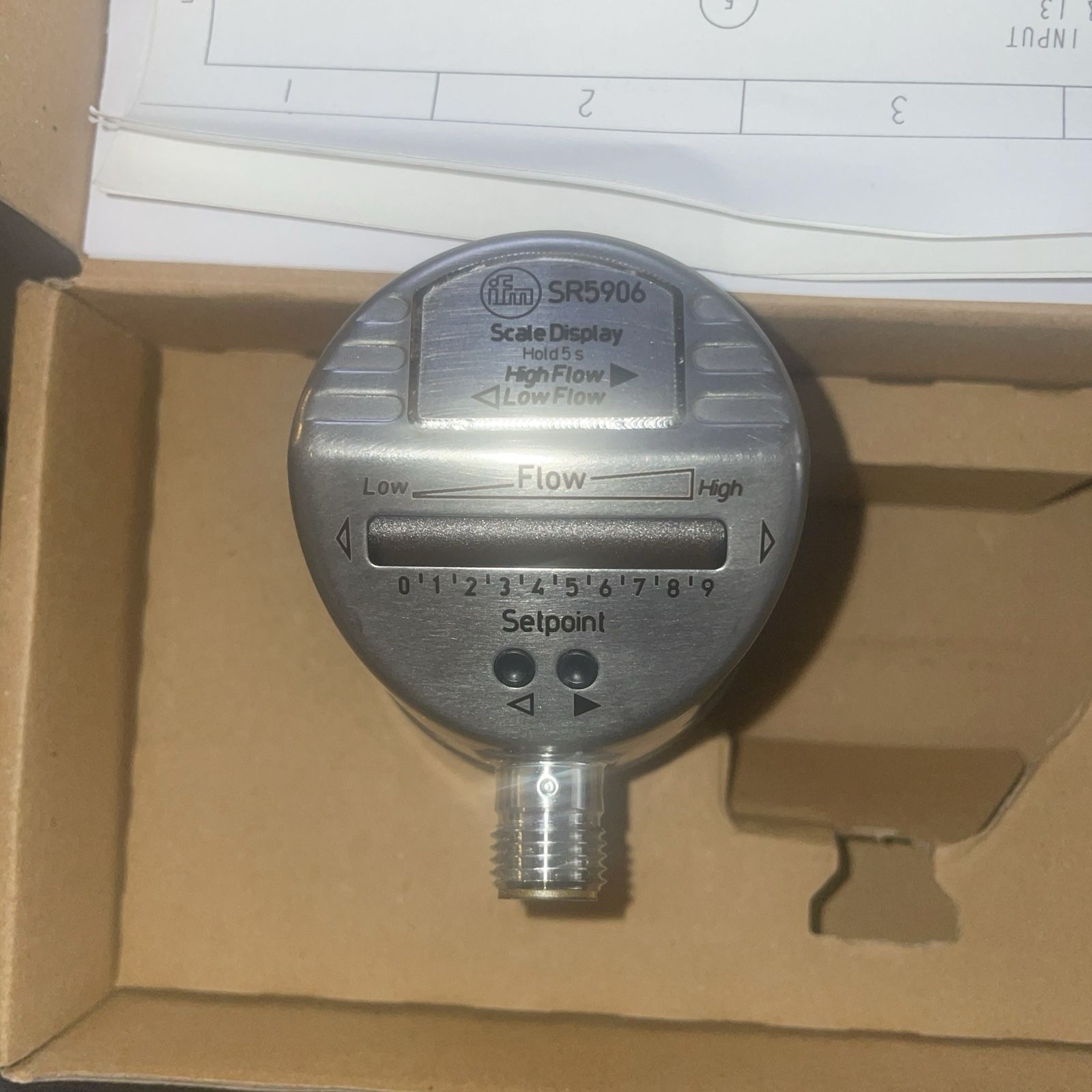 Digital flow meter with adjustable setpoint scale. Metal construction with bottom threaded connection. Features low to high flow range indicator.