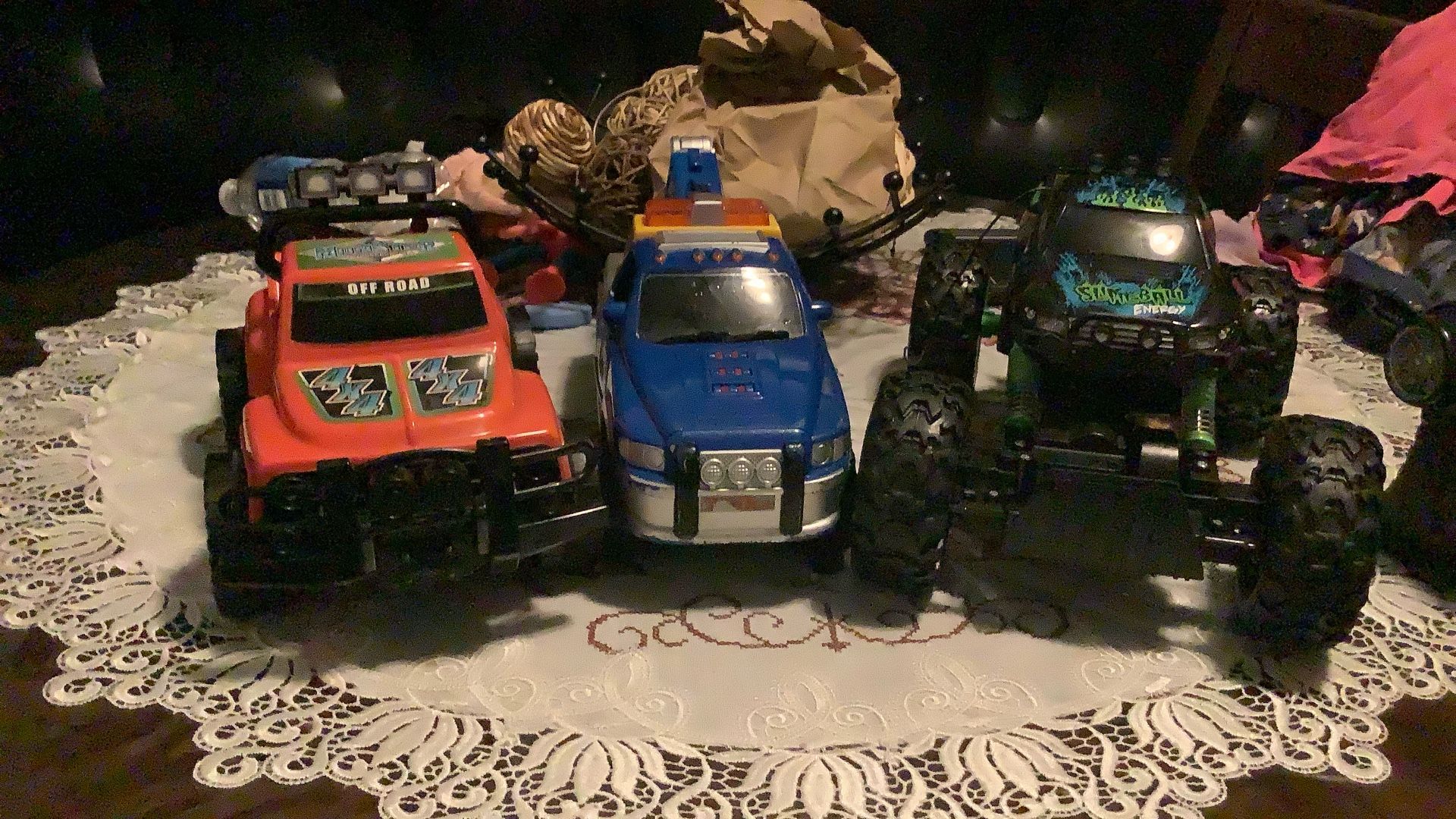 Yes, I’m trying to get rid of this three of them but all of them have different price. The red ones and the blue ones are 5$ dollars each, but not for the black green truck is $15 and you need a battery for it and if you want us to put a battery, it has gonna be $20 for itand also for the blue truck toy. I hope you don’t mind that it’s kind of scratched the sticker is kind of ruined one of the door open doors is messy one of those piece. And also if you like stuff like this, please go check out other stuff we have Lego Pokémon, PlayStation three concert, hot wheels and more. And also, if you buy your stuff, you get free treats and good deals, please and thank you.