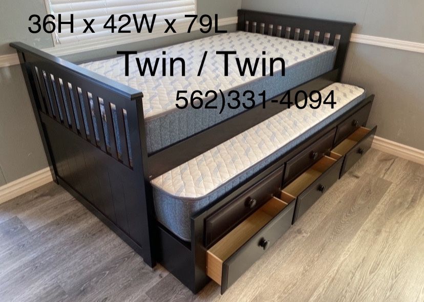New boxed sealed white or cappuccino colors wood twin/twin captain beds w/drawers & both new orthopedic mattresses included Delivery services $ Assembly $ COD Hablamos español