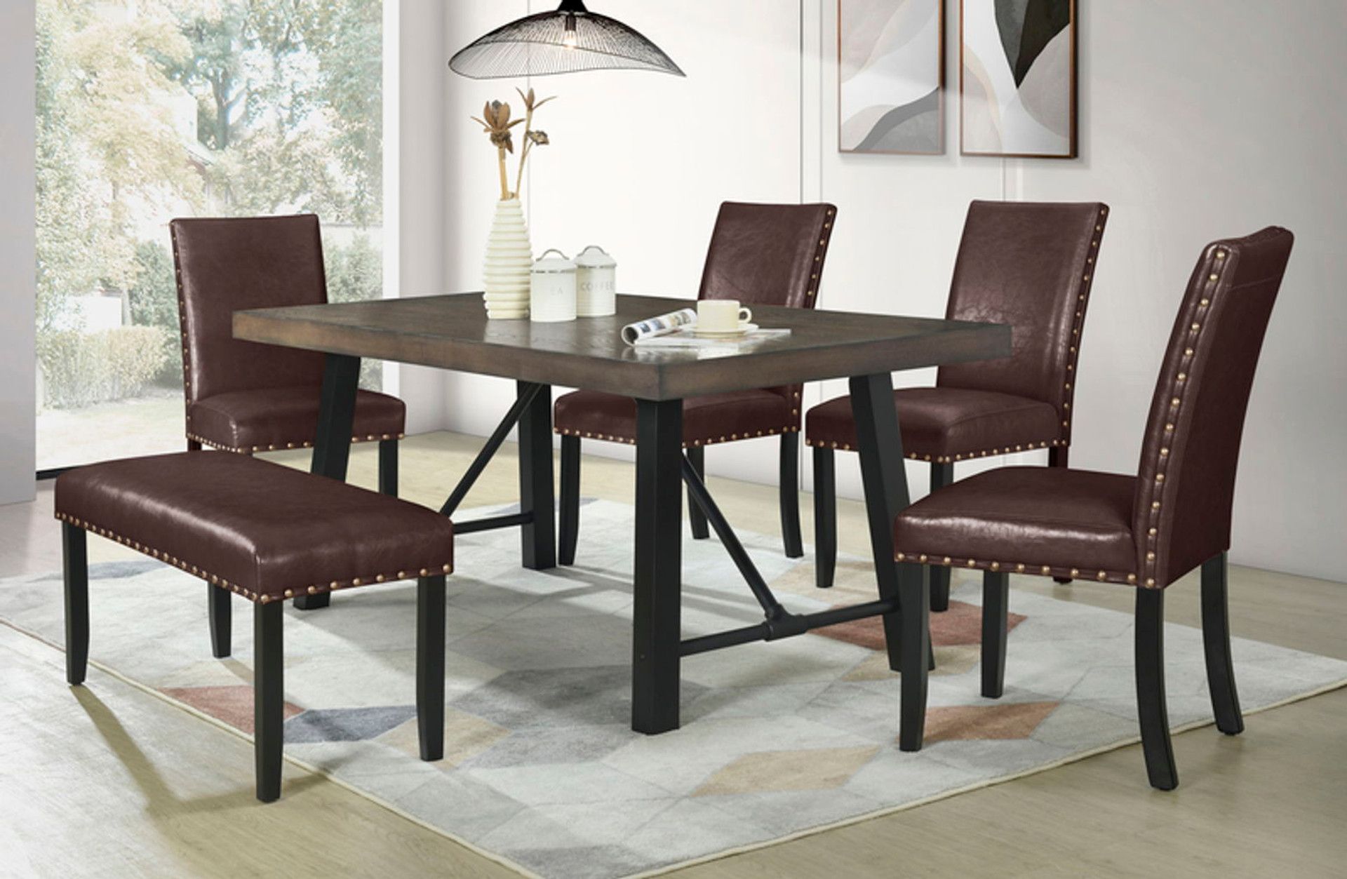 Rustica Dining Set Black Rubber Wood Base Brown Ash Veneer Top Brown PU Upholstered Seat And Back Nail Trim On Chairs Colors Available Brown or Latte This Dining Room Set Includes: 1 Table: 72″ Wide x 36″ Deep x 30″ High 4 Side Chairs: 19″ Wide X 26″ Deep X 39″High 1 Bench: 44″ Wide X 16″ Deep X 20″High Free Local Delivery ALL BRAND-NEW FURNITURE AND MATTRESSES! SPECIAL FINANCING AVAILABLE. NO CREDIT NEEDED! Just $39 down. Free delivery is available within the Dallas and Fort Worth area for select items only. Installation is also available. Financing is available for 12-18 months. 90 days with no interest. Layaway available. SE HABLA ESPANOL!