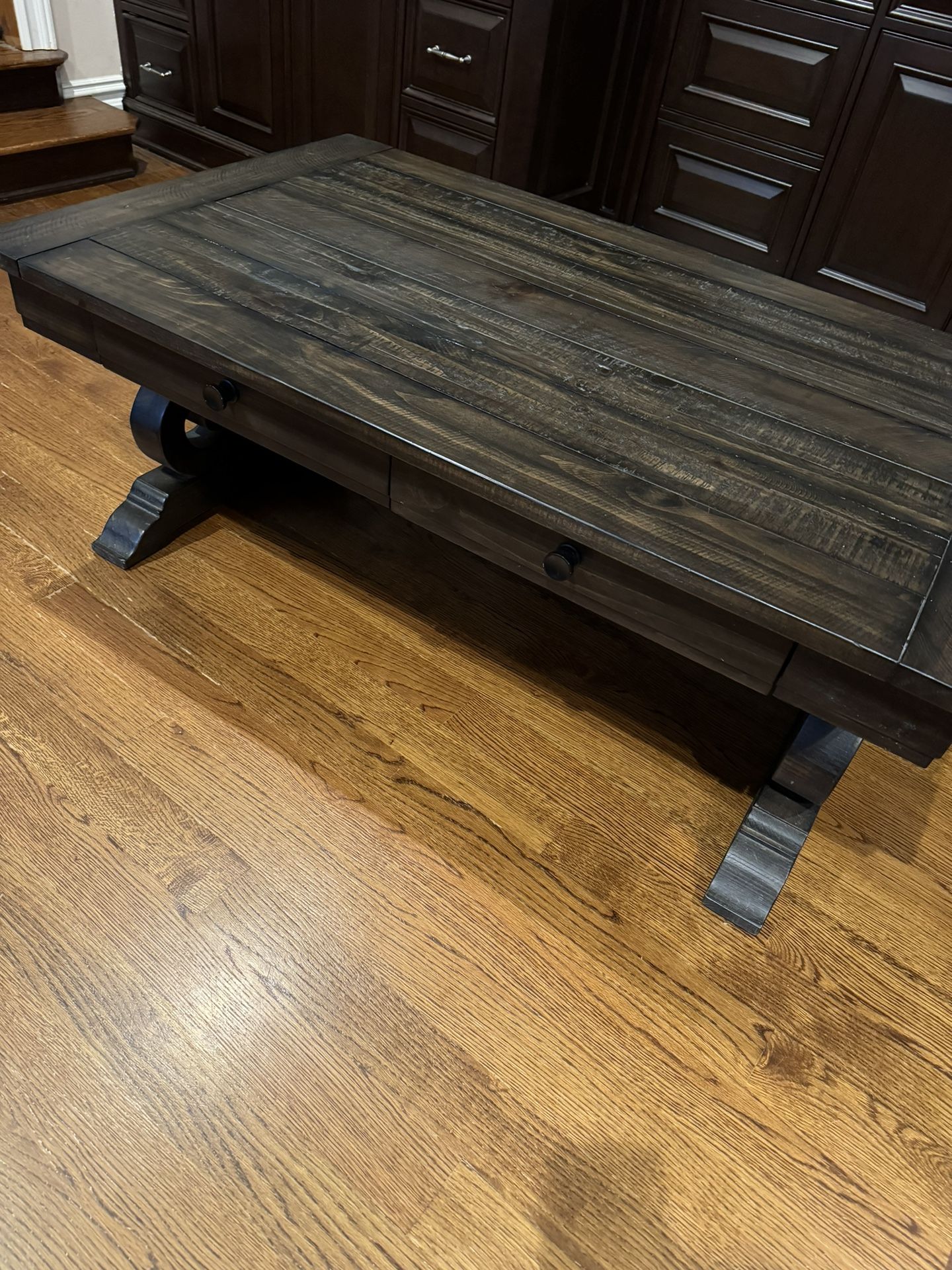 Sells for $680 + online. Excellent condition. Curved trestle base with a metal stretcher. Two spacious drawers Measures 19 inches high x 50 inches wide x 30 inches deep