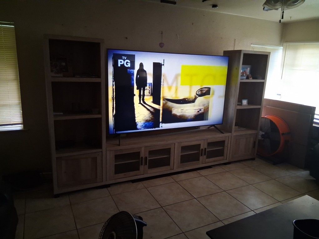 Complete living & dining room bundle—big-screen TV with full entertainment center, leather reclining sofa, coffee table, dining table with chairs, plus kitchen appliances and extras—all clean, solid, and ready to go. One pickup, one price, great deal—must sell fast.