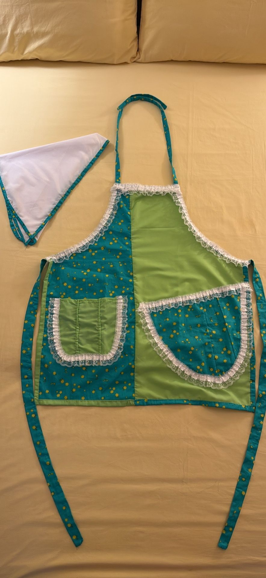 This is at home handmade apron with 100% cotton! Made with much love! Design is green and blue colors patterns, it is 28 inches long and 25.5 inches wide, around a small and medium size! Includes a matching head wrap as well! Perfect to add some fun flair to your cooking! Will accept in person cash payment.