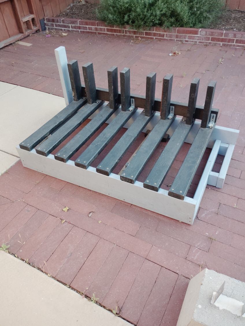custom made wooden bike rack. Fits in full size truck bed, such as a toyota tundra or similar. Fits snugly behind tire humps on bed of truck