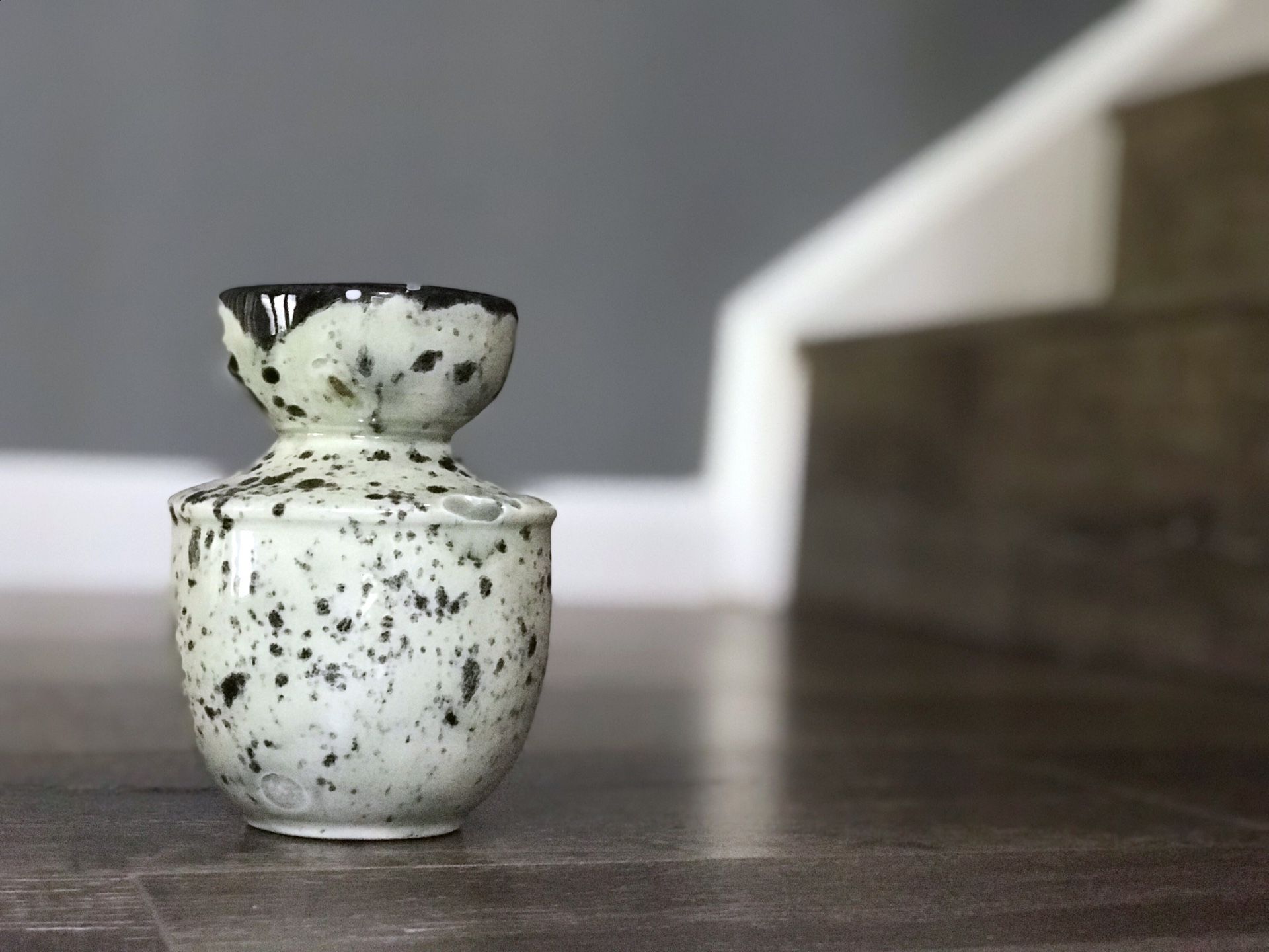 • 6 1/4 tall X 4 wide - inches • Only one of its kind. • Decorative vase makes great accent or accessory to tie in other colors for interior decoration. • Contemporary Modern Decor • color is light sandy grey, creamy whit with hints of warm and cool😎colors • It has scattered spots of black for a more contemporary art look and feel There are slight chip markings that was done before the glazing process after kiln.