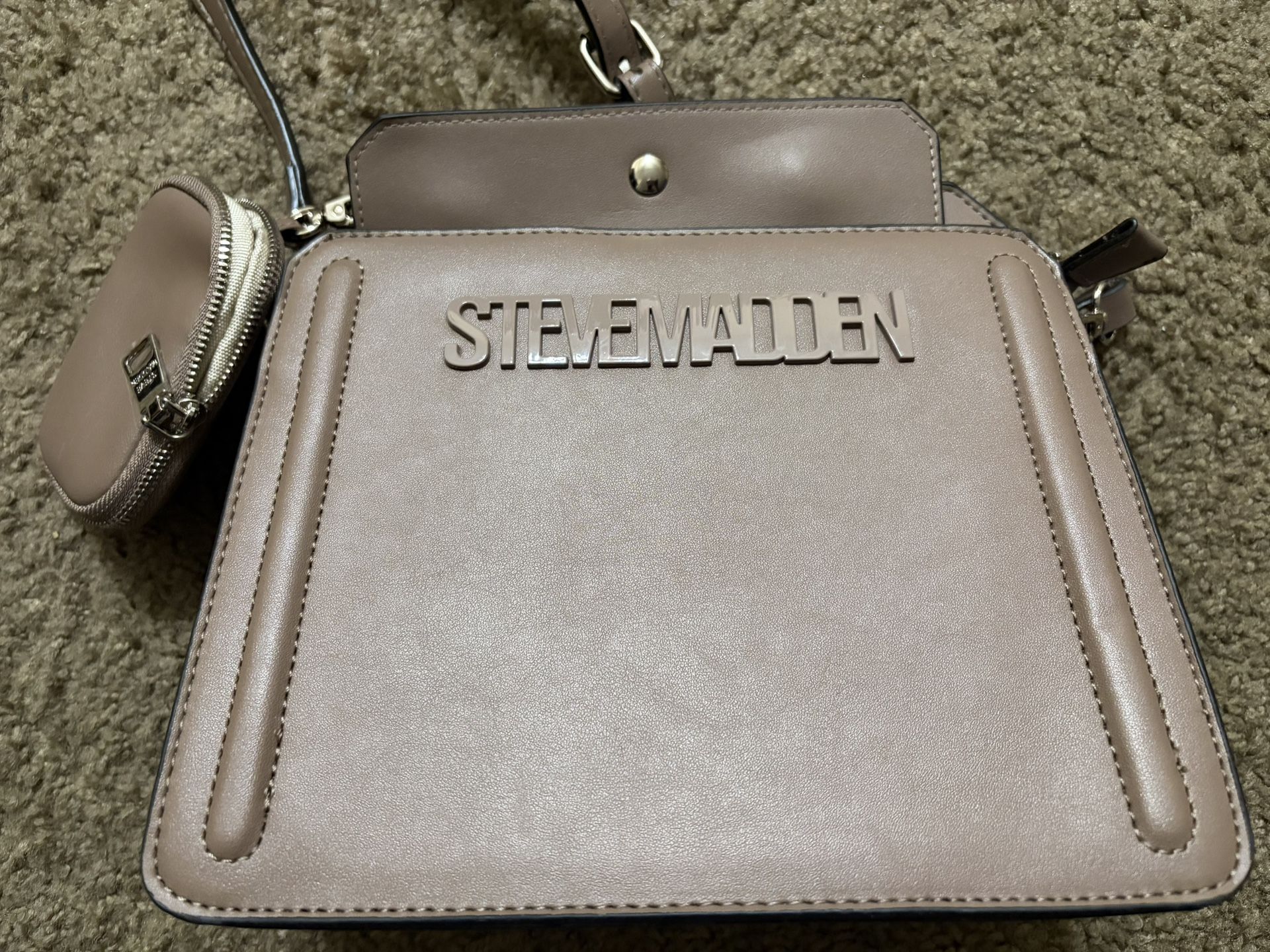 Still available - message before buying please. $20 - cash only, pick up only 100% real. Not fake. We can meet at any authentic shop to verify. Perfect for a holiday gift. Selling a Steve Madden Taupe Handbag with top handle, detachable crossbody strap, and matching mini coin pouch. Stylish and neutral tone that pairs well with any outfit. Details: • “STEVE MADDEN” metal logo on front • Includes small detachable coin pouch with zipper • Adjustable crossbody strap + sturdy top handle • Spacious interior with zipper and slip pockets • Clean interior and exterior • Durable faux leather with silver-tone hardware • Comes from a smoke-free, pet-free home Perfect everyday or casual dressy bag for errands, work, or going out. Only selling because it’s not being used. Serious buyers only.