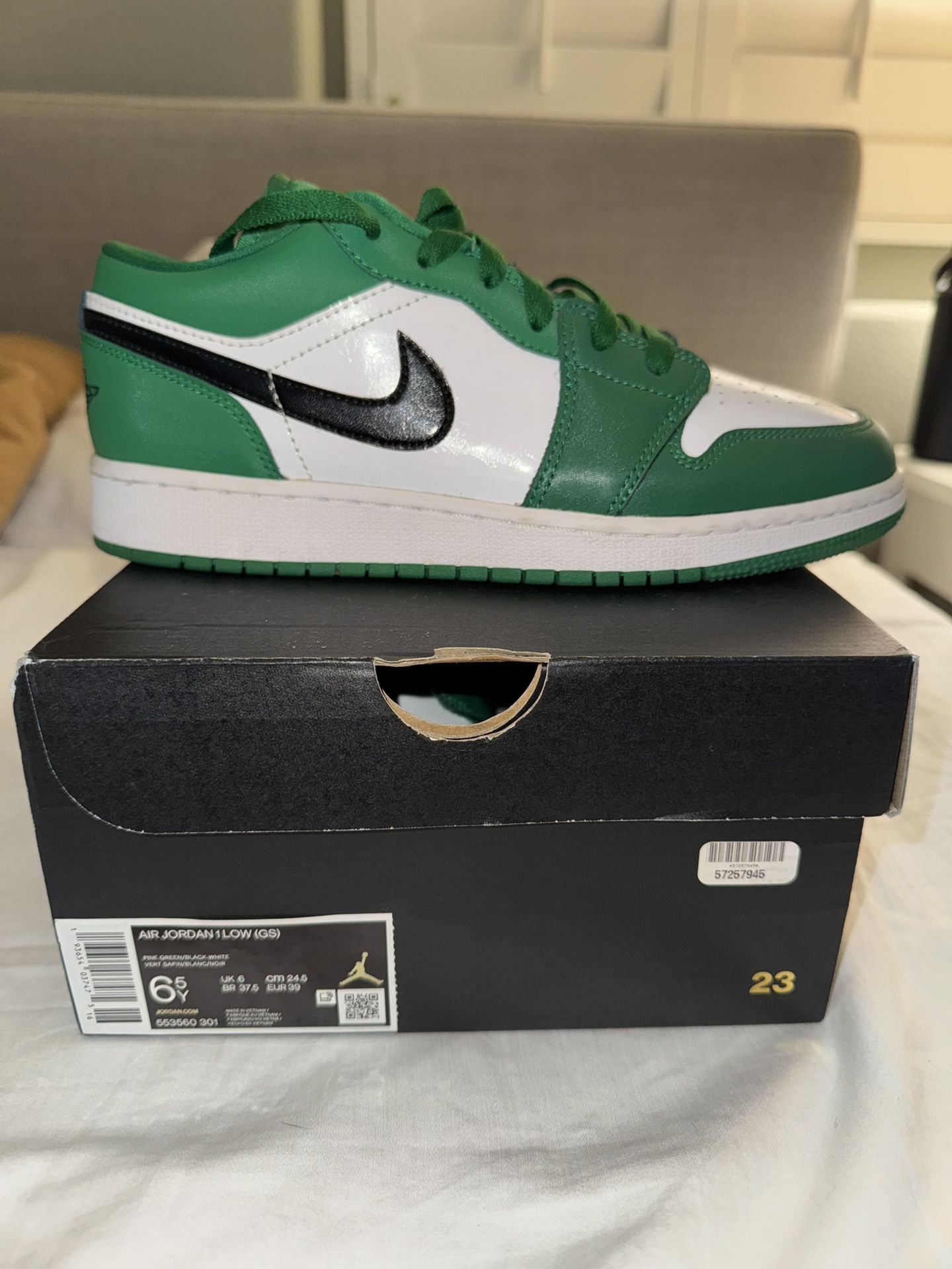 These are Air Jordan 1 low. They’re in the color Pine Green/Black-White. They have been used one time and are in super good condition. I also have a verification from Goat. I got them during quarantine and never used them again because I outgrew them. I’m selling these shoes to save up for my car.