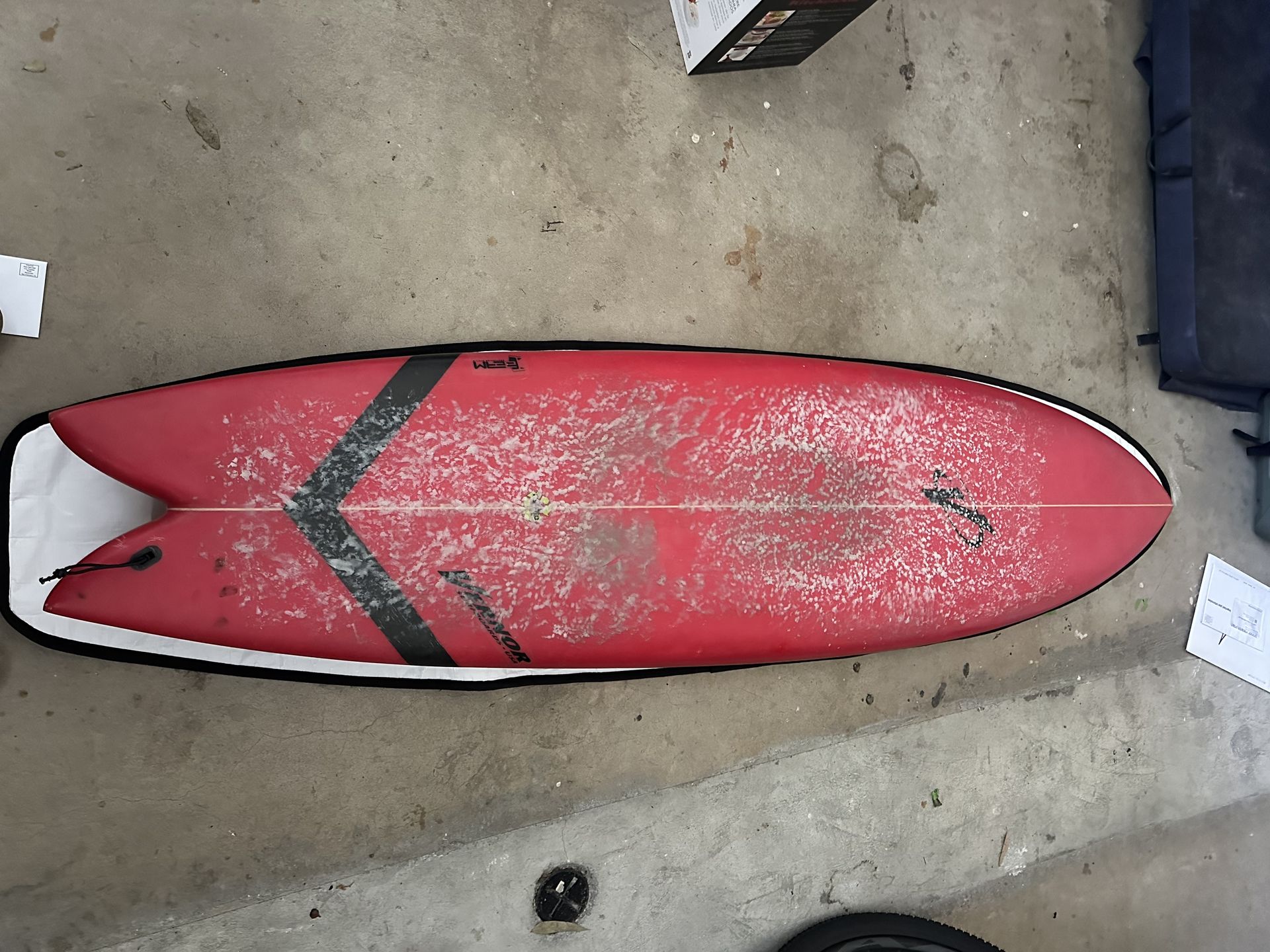 Vernor barracuda surf board, no damage, great for a larger person or beginner looking to transition from a foam or long board to something more maneuverable. This board is too big for me and looking thin out the quiver. Fins included