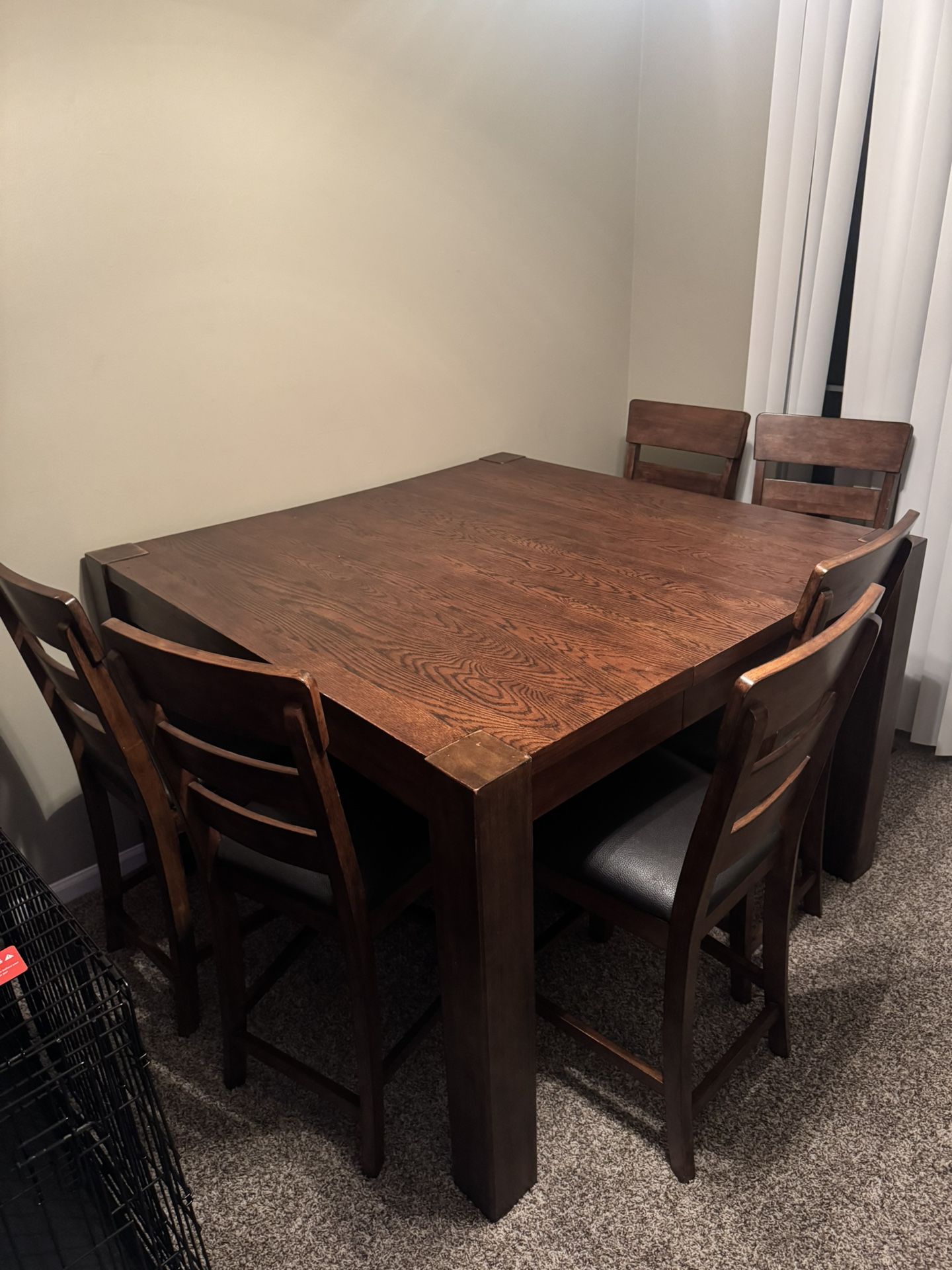 Used with some scratches but good condition! Comes with 8 leather chairs! Table is heavy so must be able to carry out and take in one piece! The table is 36 inches tall and 53 inches wide!