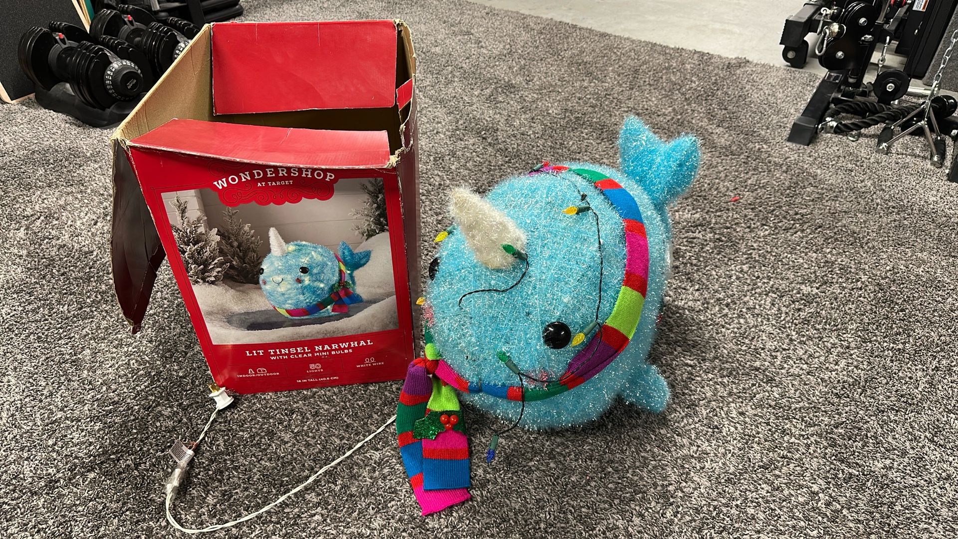 Lit Tinsel Narwhal Lights work We added an extra color strand that is zip tied on there. Missing the smile insert