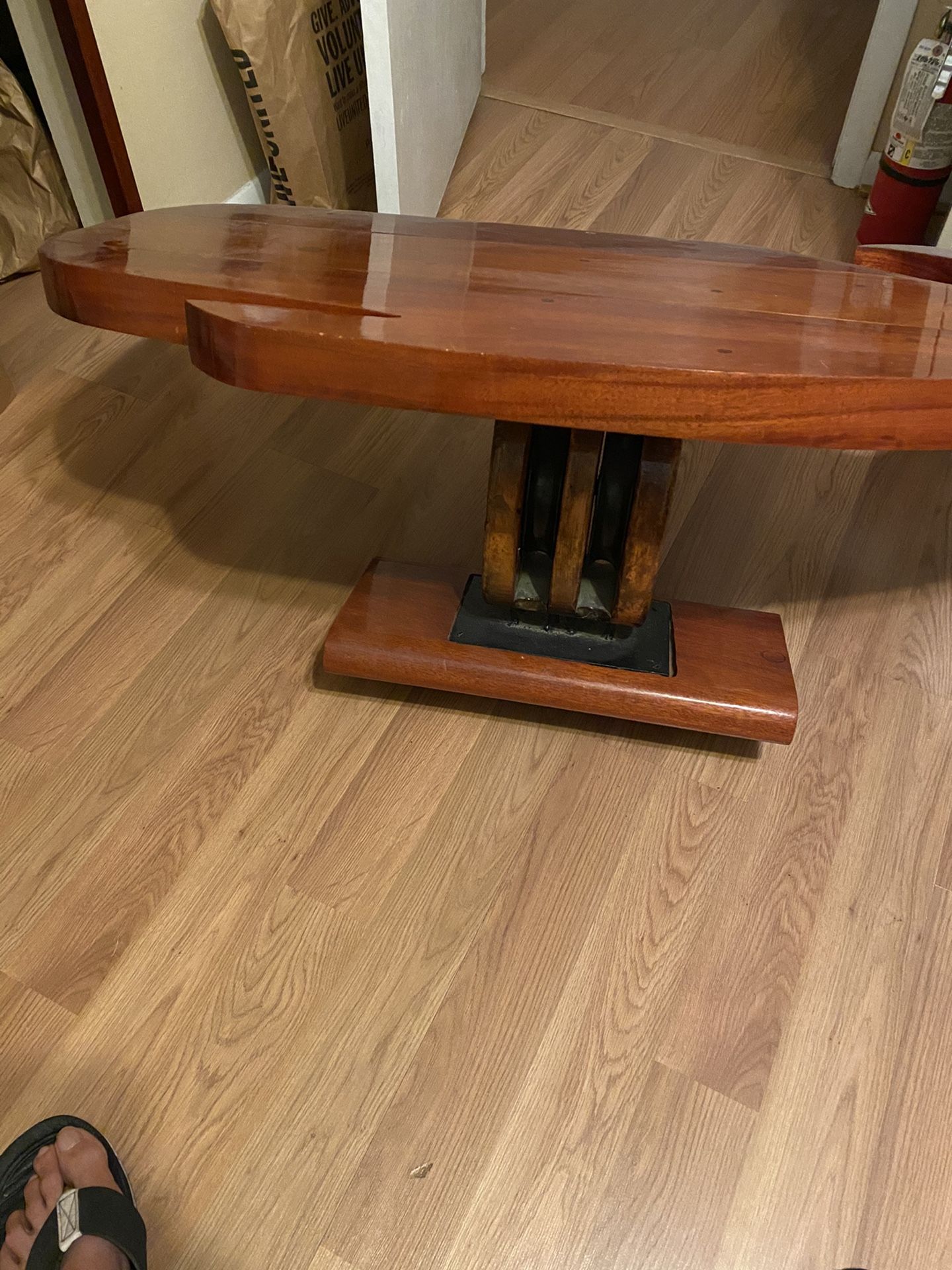Thick solid teak whale top table cut from deck of old sail boat with marine pulley leg on solid teal base. Excellent condition.