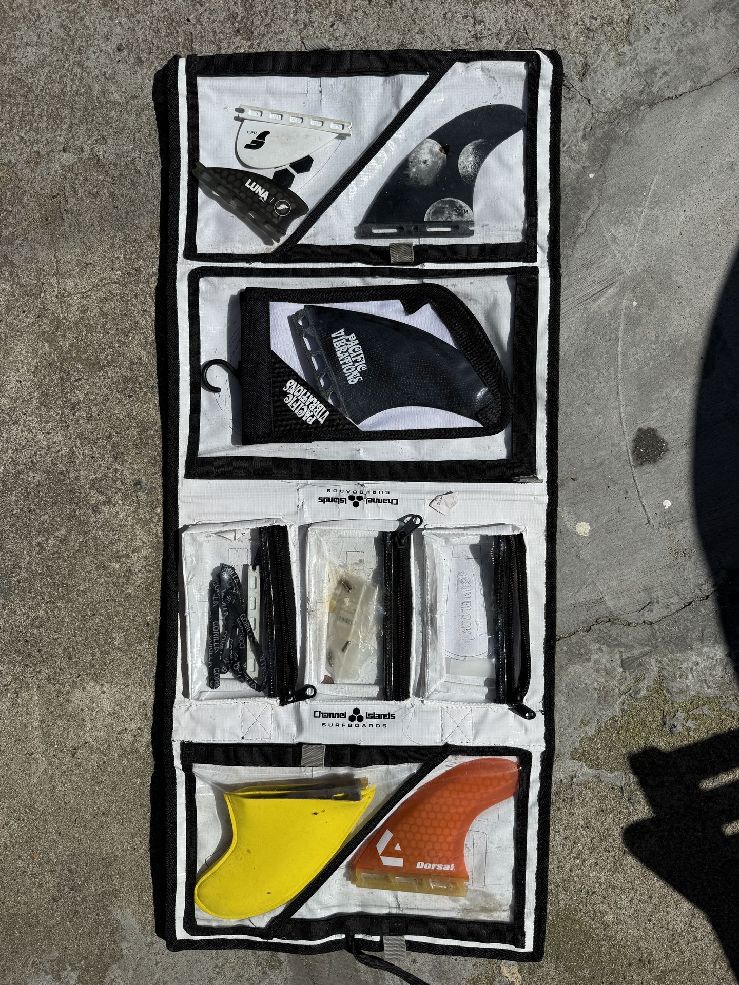 Includes the satchel and the following: Large twin fins 2 center nubbin fins 1 center thruster Quad set Extra fin set screws Extra leash ties