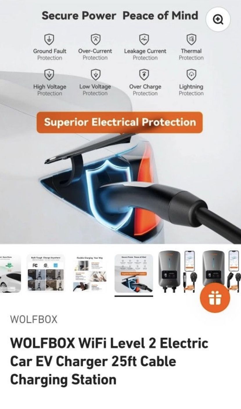 * Brand new home EV CHARGER * Charging & Cost Savings: * Offers charging speeds up to 7-9 times faster than level 1 chargers, providing 38-48 miles of range in just one hour. * Supports app management and Wi-Fi connectivity, allowing real-time monitoring of charging data, adjusting current intensity, and scheduling charging times to take advantage of off-peak rates, thereby reducing electricity bills. * Safety & Durability: * CSA Certified & NEMA Type 4: This EV charger is CSA certified and complies with UL2594 safety standards, ensuring reliable safety and performance. * This electric car charger features durable NEMA 4X waterproof housing, making it resistant to environmental factors. With a 25ft premium cable included, you can confidently charge your vehicle in any weather conditions. * Flexible Installation & Compatibility: * The WOLFBOX EV charger is Easy to install with an connector, a 25ft extension cable, an EV charger holder, and all necessary tools included, suitable for both indoor and outdoor use. We've also included installation instructions are provided to guide you through the setup process, ensuring a smooth and hassle-free installation experience. * The wall-mounted EV charger is compatible with all electric vehicle models of the same style.For optimal performance and safety, we recommend installing the charger—whether it's 40 Amp, 48 Amp, or 50 Amp—on a circuit breaker rated appropriately higher: 50A for the 40 Amp charger, 60A for the 48 Amp charger, and 70A or greater for the 50 Amp charger. Please consult a professional electrician for installation. Note: Tesla EVs need to be equipped with a special adapter to be compatible. * Smart Control & Easy Management: * Features a 4.3-inch LCD screen displaying charging rate, time, voltage, and charged amount for real-time updates. * Allows Google account login and integrates seamlessly with Alexa and Google Assistant for voice control, enabling multiple users to manage the device simultaneously for enhanced convenience