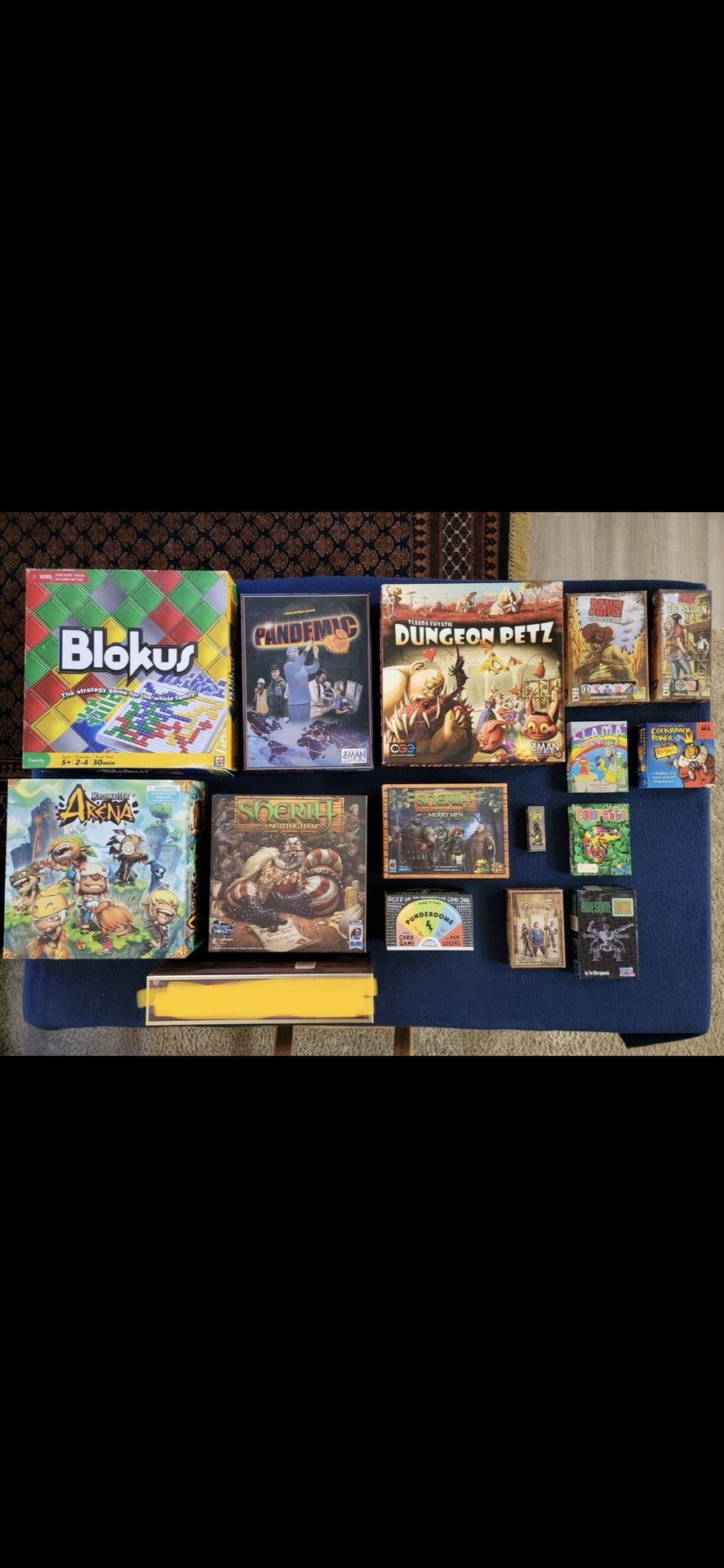 All games have complete pieces/boards and are in excellent condition. We love board games and just need to rotate out our collection! If you buy more than 1 board game, please take 10% off the total. Most prices are up for negotiation. Venmo/Zelle/cash OK, pick up only. $5 Spy (free) Blokus Coloretto Awesome Bots BANG! The dice game Old Saloon — SOLD! Punderdome The Guild 3 The card game L.L.A.M.A $15 Cockroach Poker Royal BANG! The dice game Pandemic Sheriff of Nottingham: Merry Men $30 Dungeon Petz Krosmaster: Arena $50 — firm on price Sheriff of Nottingham