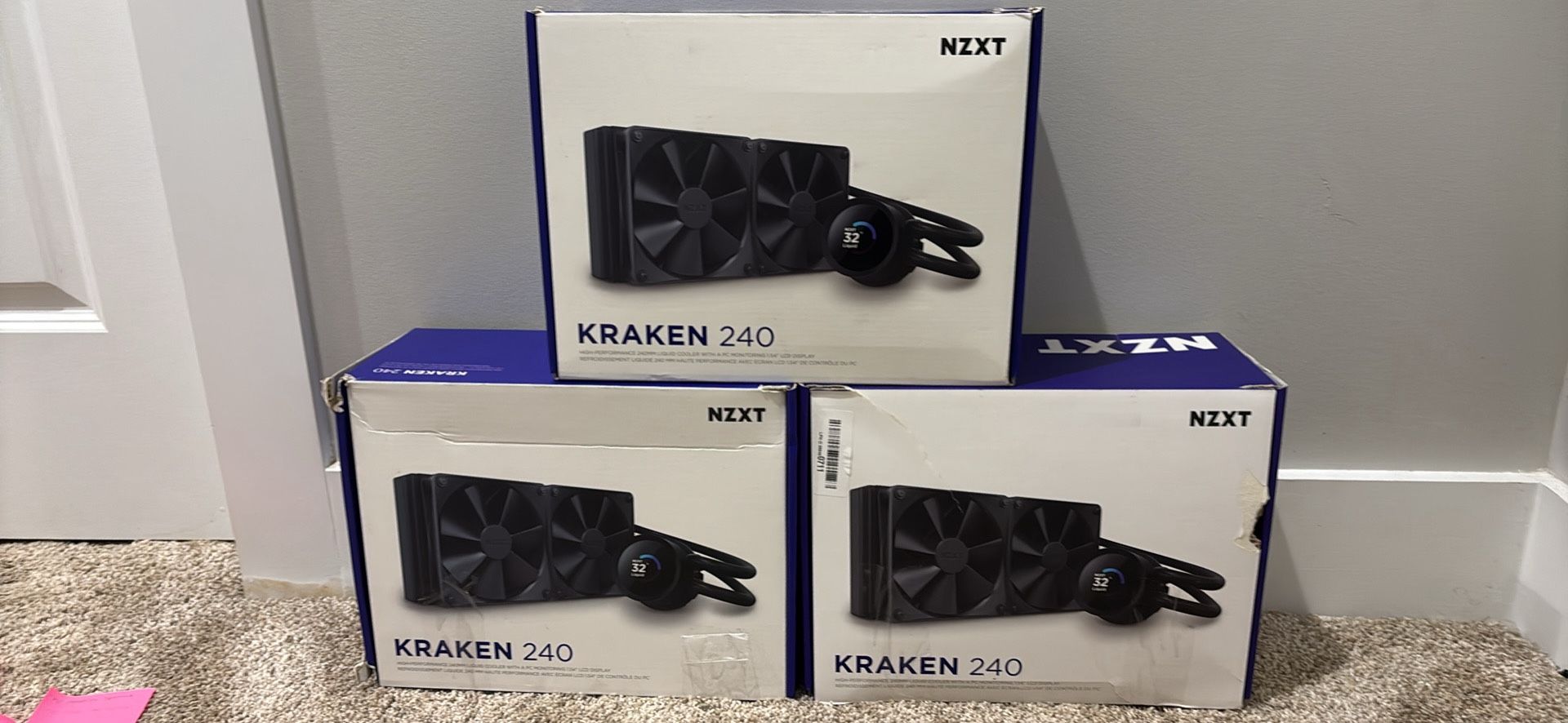 There is a total of 3 NZXT Kraken 240 2x120mm AiO Liquid CPU Cooler - Matte Black - LCD Display (1st) water cooler - $80, is in really good condition and little to no dent on the radiator and in great condition and comes with all the mounting screws and brackets. (2nd) water cooler - $75, it is in pretty good condition, but has 3 small dents on the radiator, but does not affect it at all and still works perfectly fine and comes mounting screws and brackets. (3rd) water cooler - $50, it’s in ok condition does have a lot of dents, but still doesn’t affect and still works. It also comes with the AMD and Intel brackets but with no mountain screws. I can do both deals for the two good condition ones for $145 or all for $180.