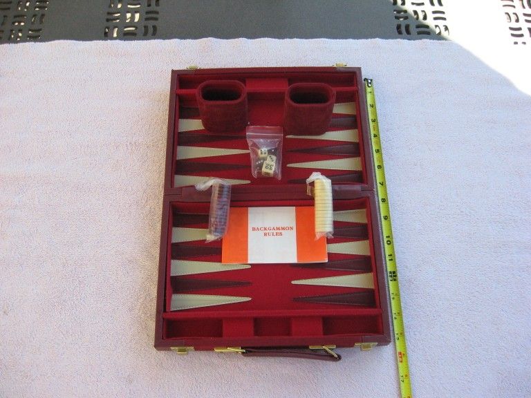 Backgammon Game In Small Brown Leatherette & Red Velour Case-Complete!