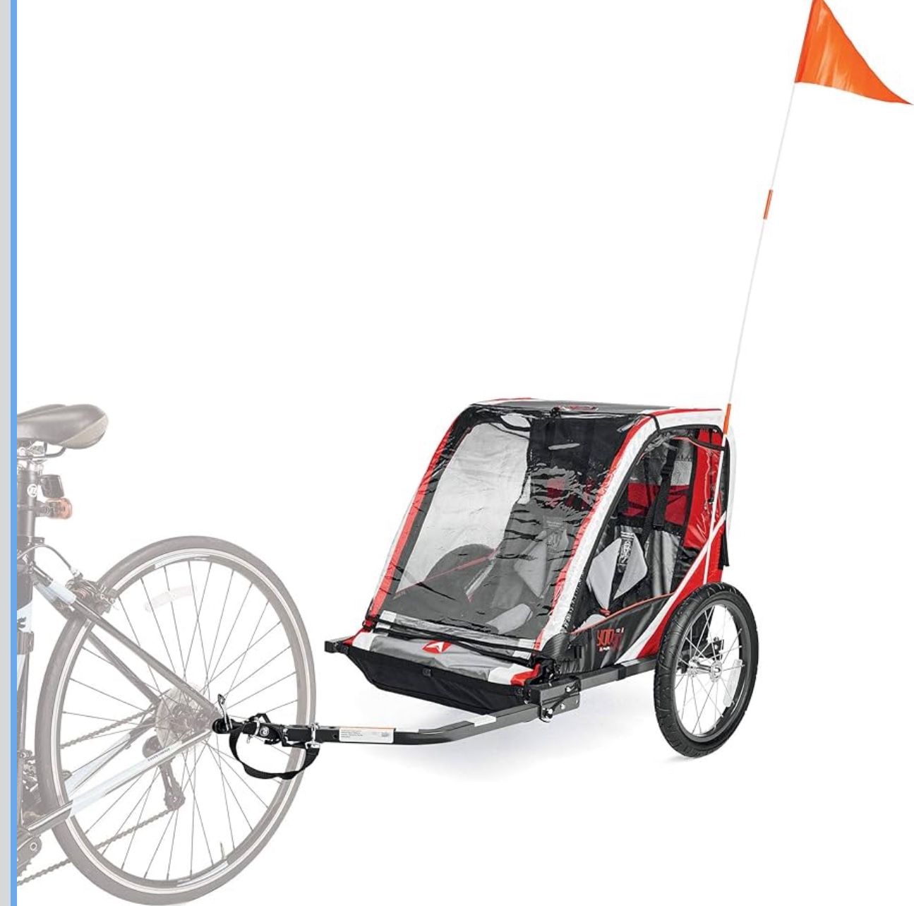 The Allen Sports child bicycle trailer offers the perfect outdoor solution for active parents. Rugged framed Bicycle Trailer. Safely and comfortably transports your children (up to 50 LB per passenger max payload). Lightweight steel construction trailer with durable quick release 16" steel wheels. Large front and side windows provide a bright, airy cabin for your little riders. Footguard tube protect passenger's feet, and a padded five-point safety harness comfortably holds your child in place. Folding design with quick release wheels makes for easy transport and storage. Universal coupler secures to your bicycle's rear axle and makes installation and removal from your bicycle a snap. Trailer includes a safety flag for added visibility when riding.
