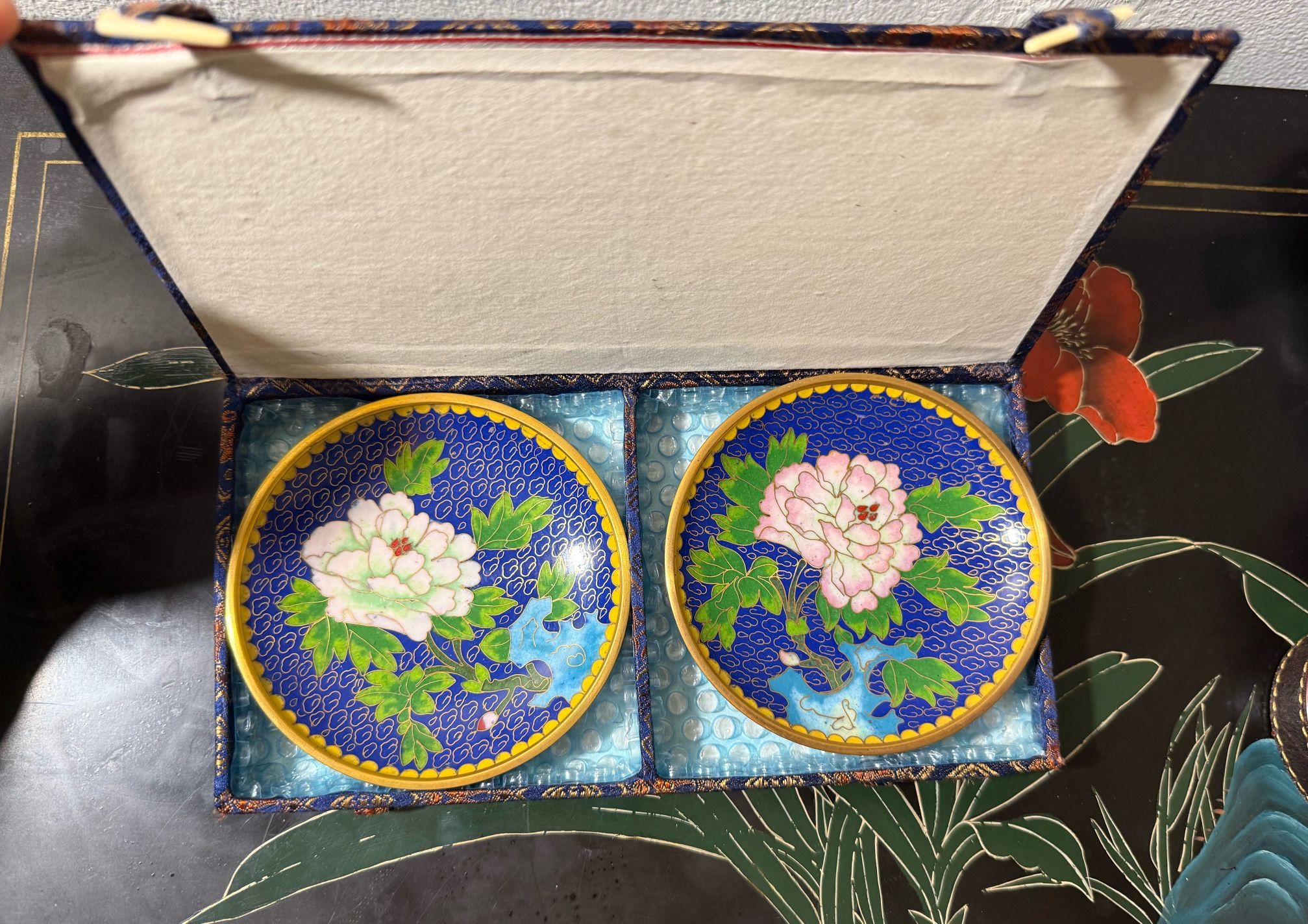 Vintage Chinese Cloisonne Plates in Case Beautiful Peony