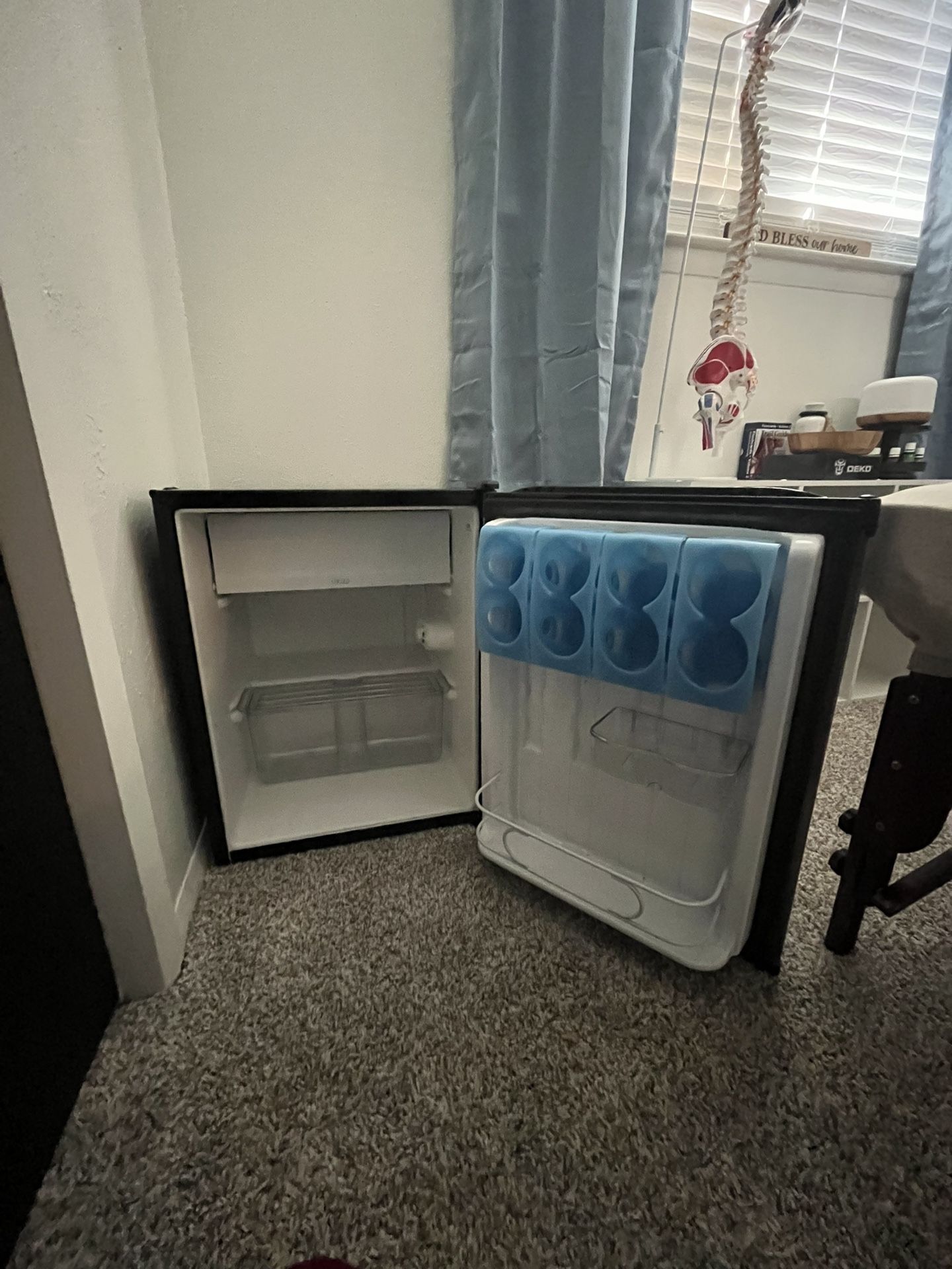 Whirlpool mini fridge. Used but works great still. Keeps things VERY cold.