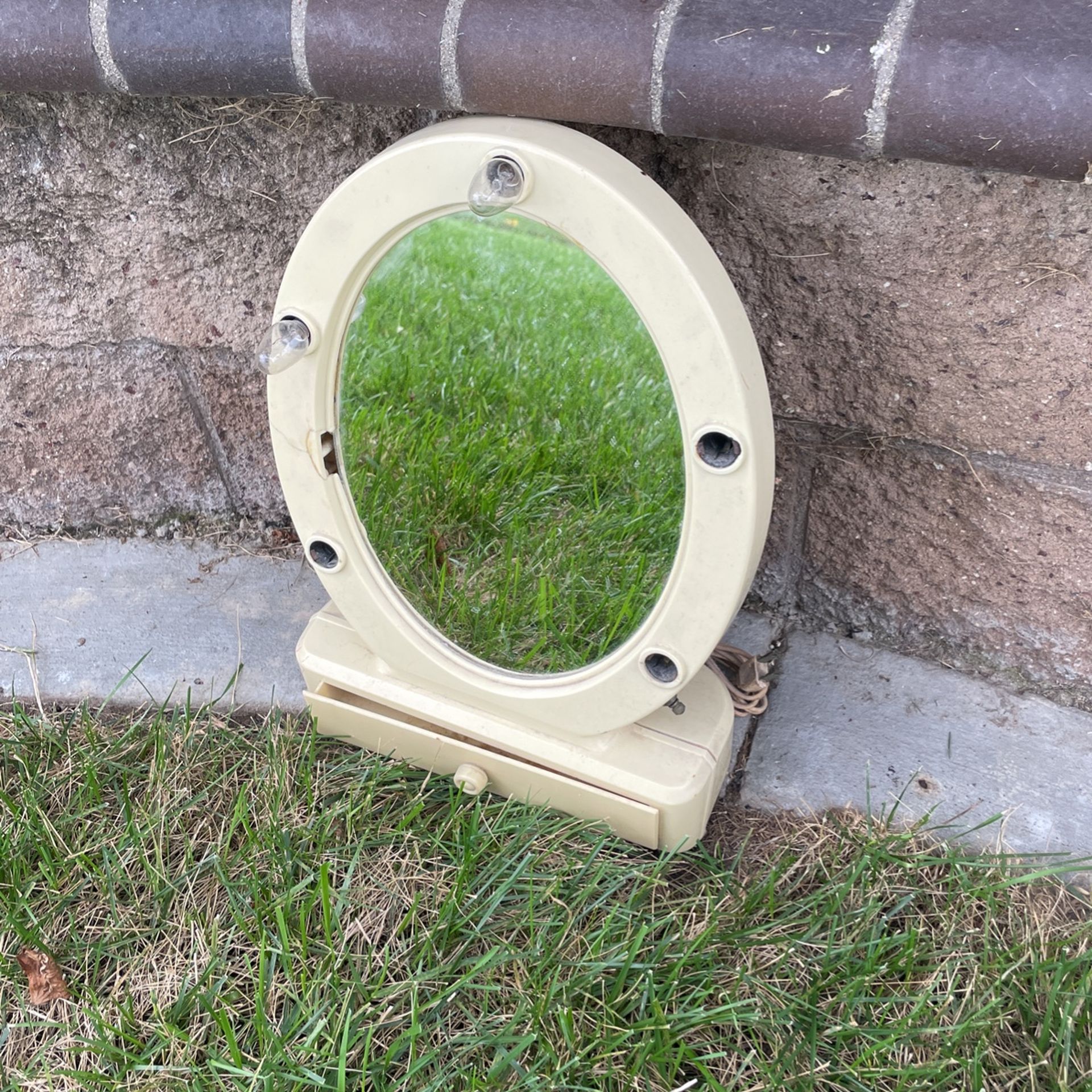 Vintage 1950s vanity mirror with light bulbs. The bulbs turn on when connected. The frame has a small crack that was glued at some point. The is a small storage drawer. Measures16 inches tall by11 inches wide.