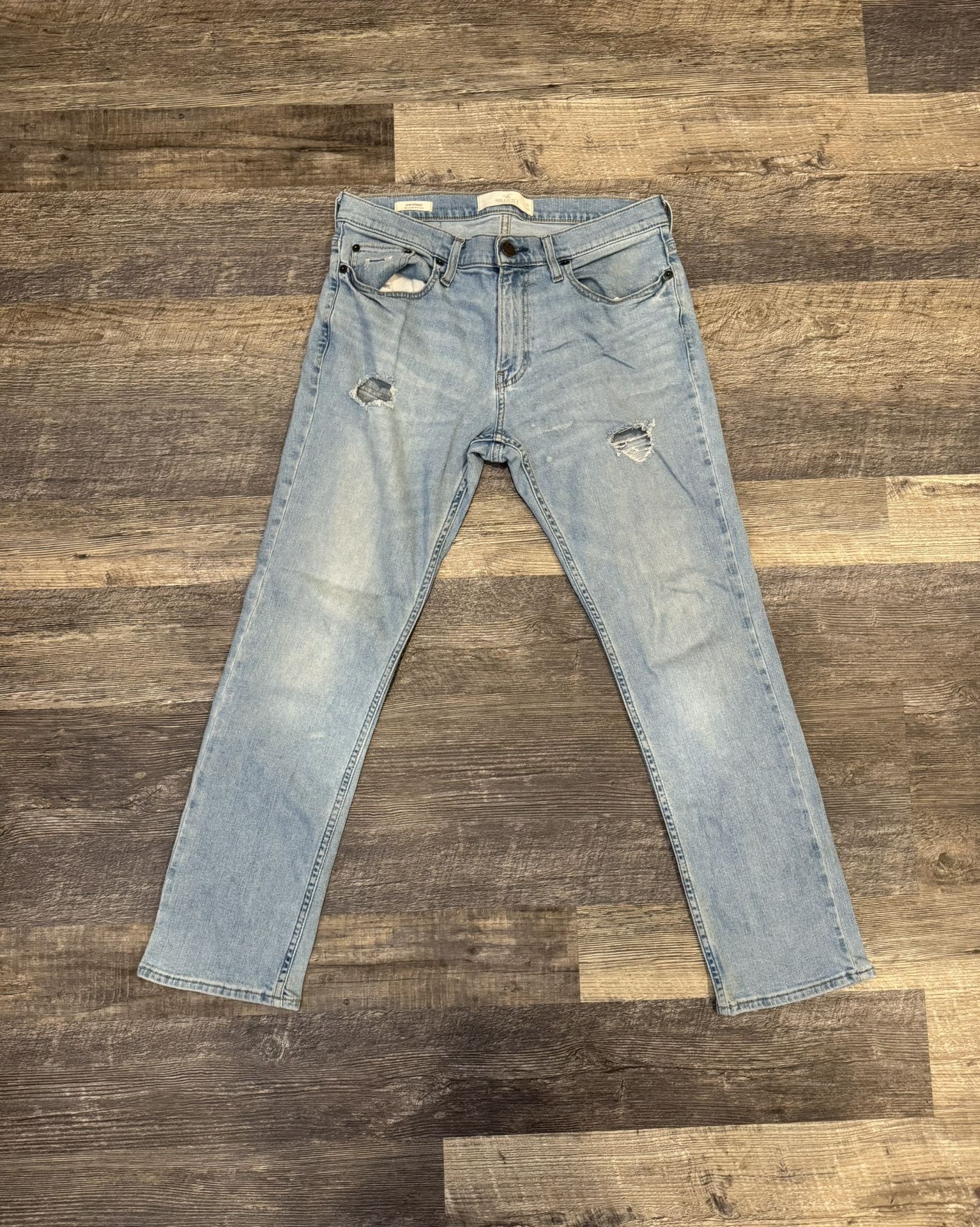 Hollister Slim Straight Epic Flex Jeans Comfy slim straight jeans perfect for any casual fit. Jeans have holes on thighs for style and stretch #y2k #jeans #hollister #casual Size: W - 31 L - 30 Material: 95% Cotton, 4% Polyester, 1% Elastane