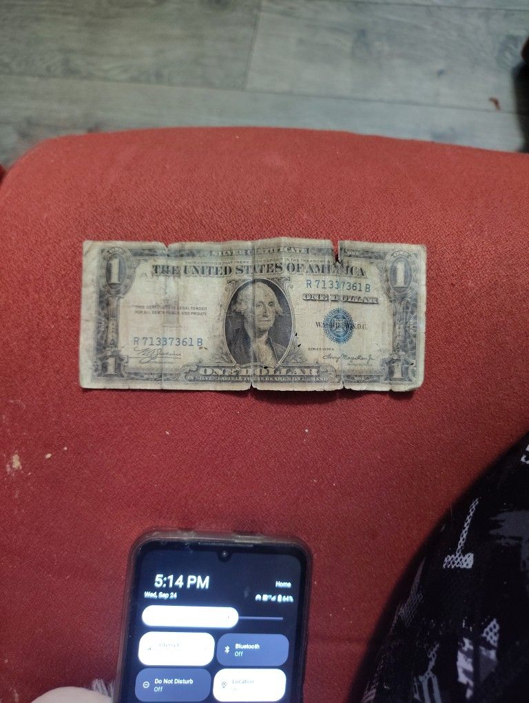 One dollar bill 1935 A series, blue stamp, circulated but decent shape. Double digits