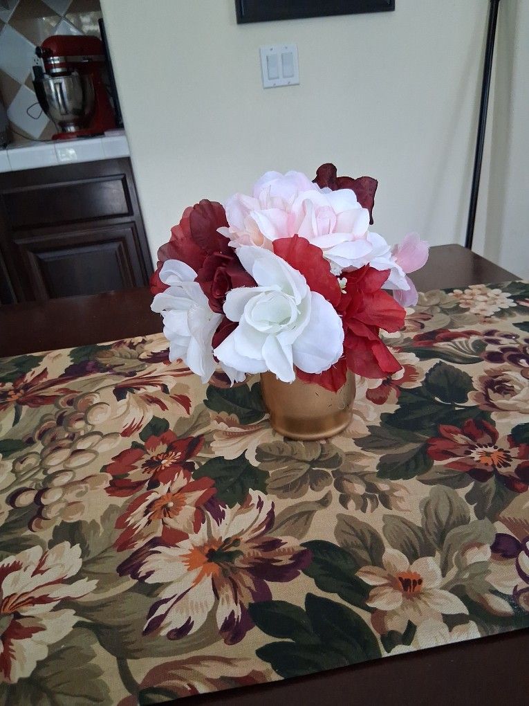 Beautiful centerpieces. Best quality flowers in burgundy creme white and pinks colors. Great for wedding. created in a gold glass vase. Set of 10 is firm at $99.