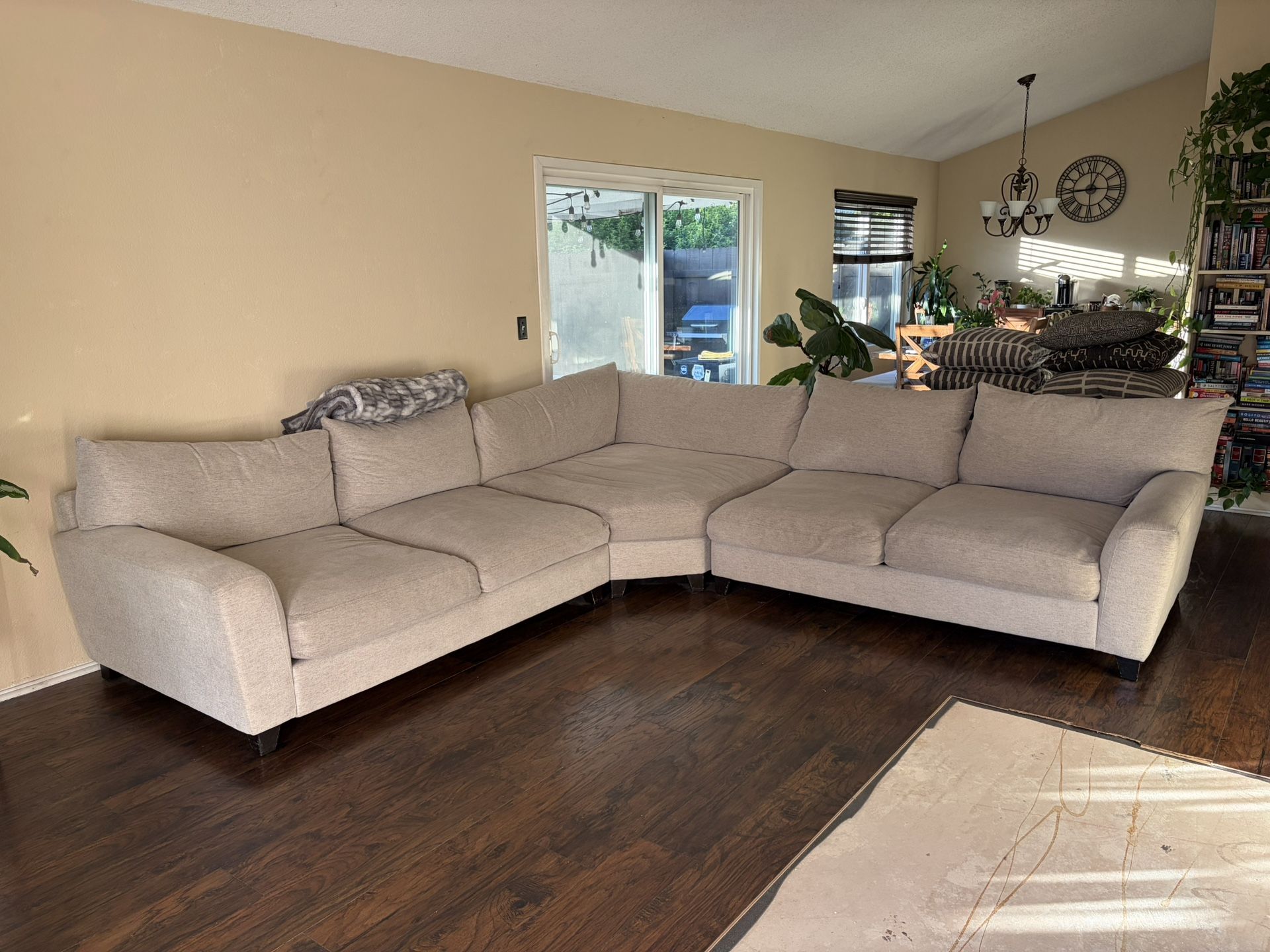 *Getting new furniture, need this gone.* Large, 3 piece sectional sofa. dimensions are: Each side is 10ft. 3 inch long, and the couch is 3ft. 2 inch deep In great condition and well maintained, no tears, or stains. Deep seating, with very soft, comfortable pillows for support. Covers from seat cushions and back pillows are removable. Pillows and cushions are feather filled. No sagging, and no sinking. Smoke free Pet free No rips No stains Covers removable and washable