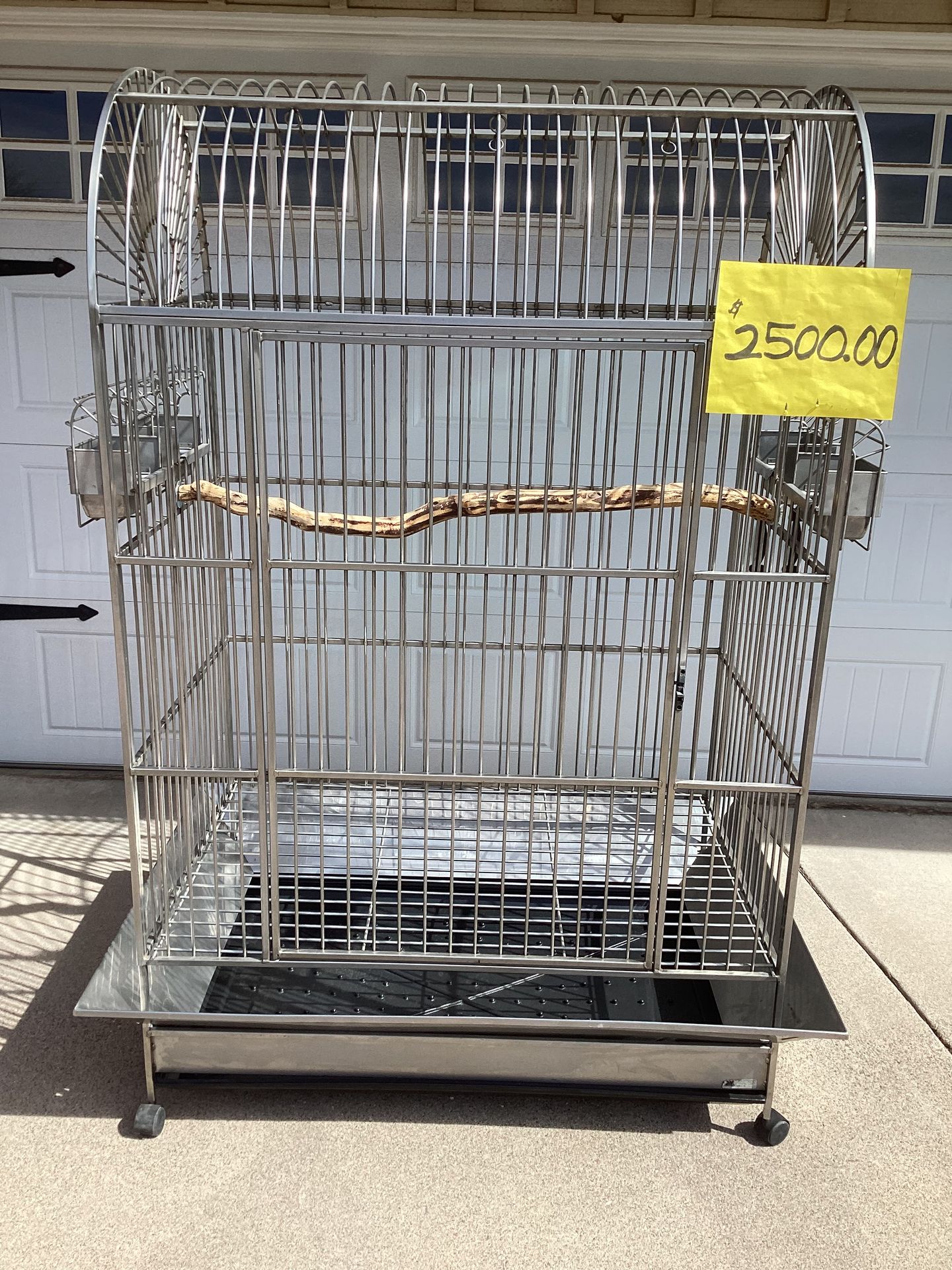 Macaw / Parrot / Animal Environments Stainless Steel Cage. Animal Environments Brand Stainless Steel Macaw Cage. High quality brand cage with four food and water areas that hang on the outside of the cage. 45 1/2 inches wide / if including the hanging outside food and water areas 53 inches wide. 29 inches deep. 72 1/2 inches tall. 1 1/2 inch bar spacing opening. 6 welded stainless rings for hanging toys. Clean and in like new condition. If it was brand new it would be over $6000.00. Please see all pictures for size and information. $2500.00 cash.