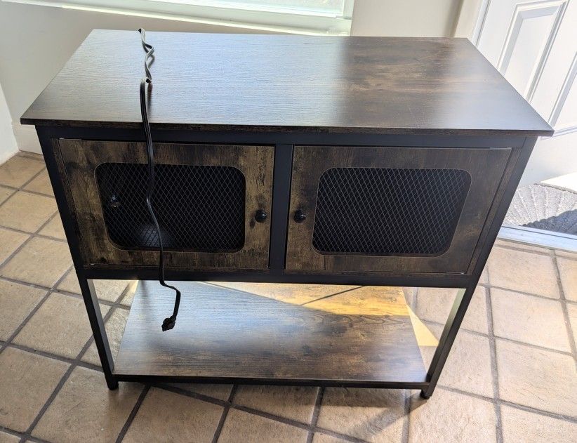 Glass reptile terrarium 40 gallons. The hinged lid is slightly oversized. There is a repaired chip on the right door. 36x18x18 Stand has power outlets