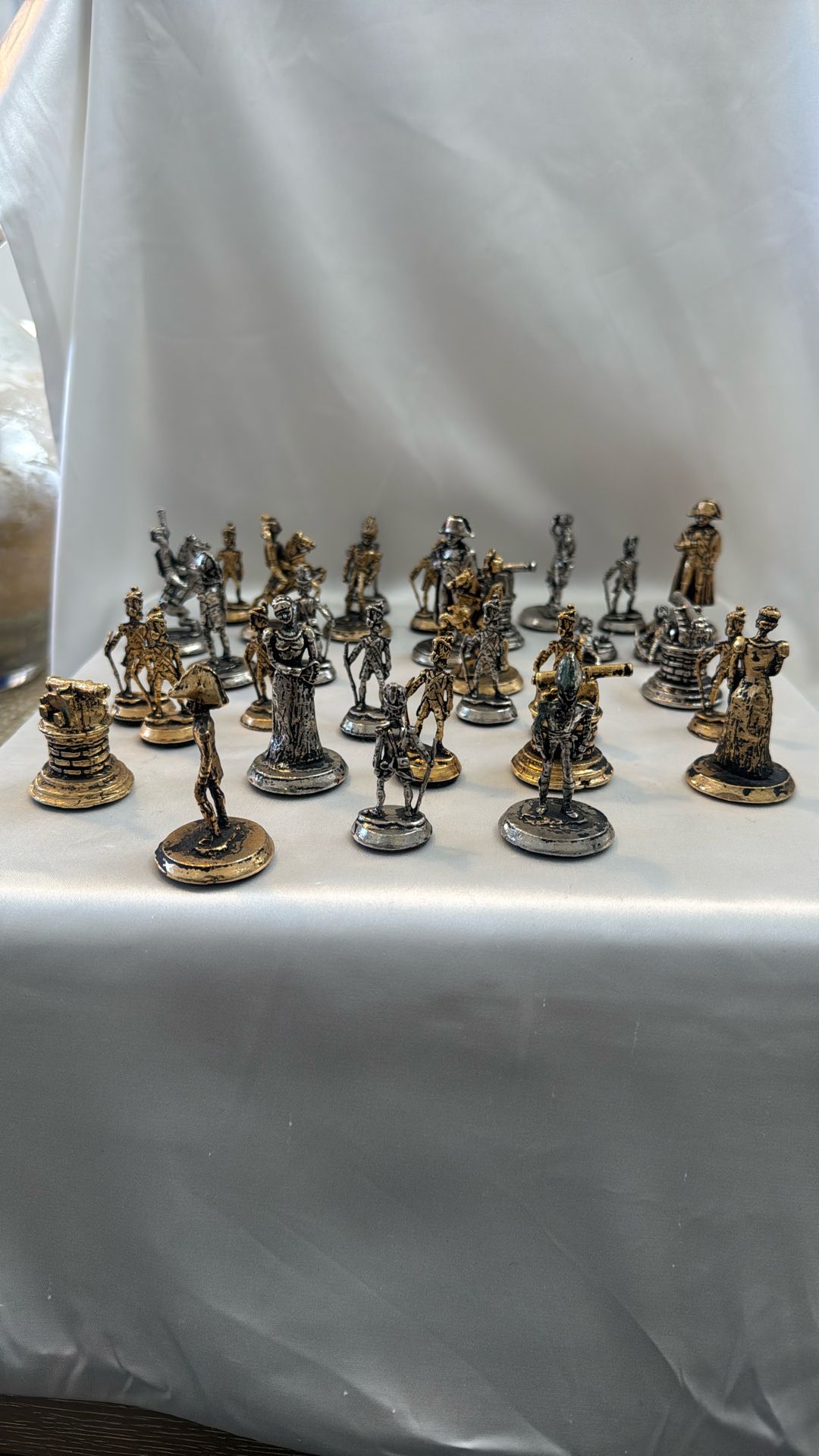 Vintage Heavy Metal Chess Set – 32 Pieces – Fantasy Style DESCRIPTION Vintage decorative heavy metal chess set with fantasy / historical figures. 32 total pieces Solid and heavy (not lightweight) Gold & silver tone Great for decor, collectors, or display ⚠️ 2 pieces are damaged – please see photos. No maker’s mark (common for vintage imported metal chess sets)