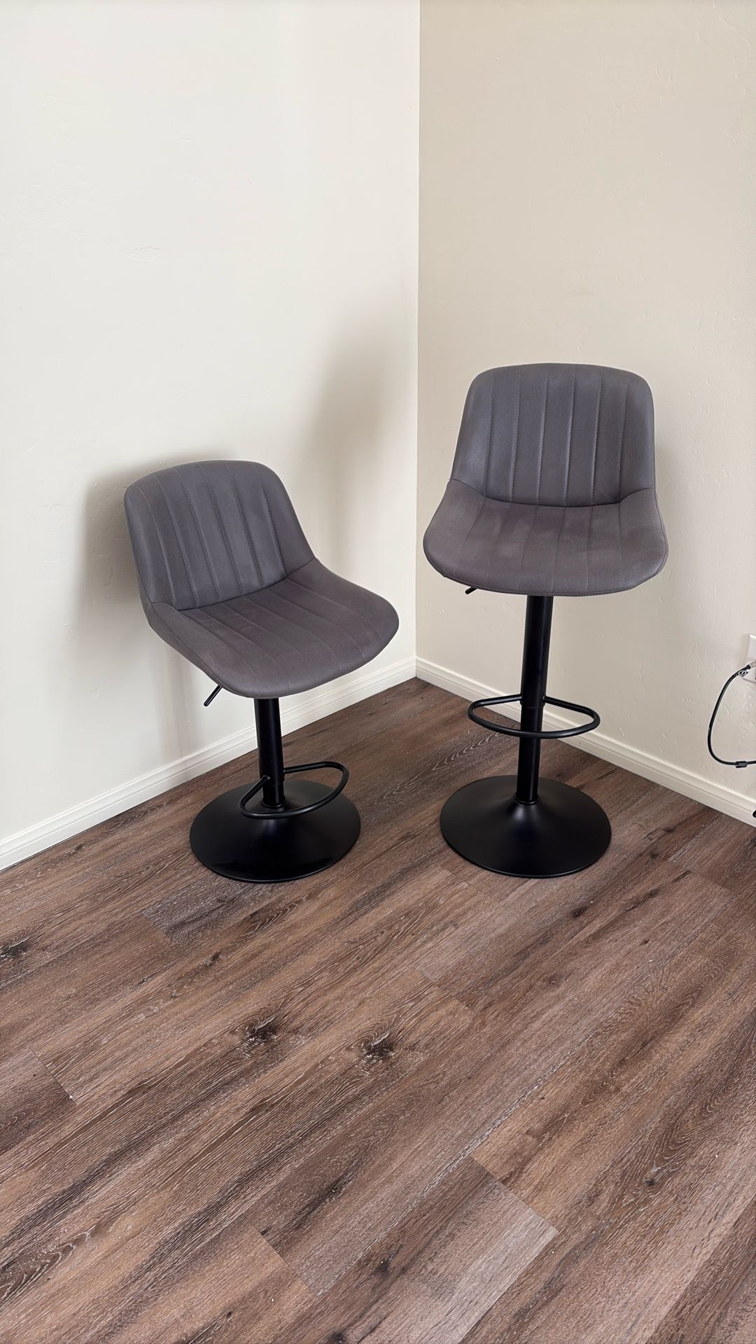 Set of two adjustable and swiveling chairs. Located in downtown area. I had these chairs for about 4 months and hardly even used them. Still in great condition. Fabric is suede like.