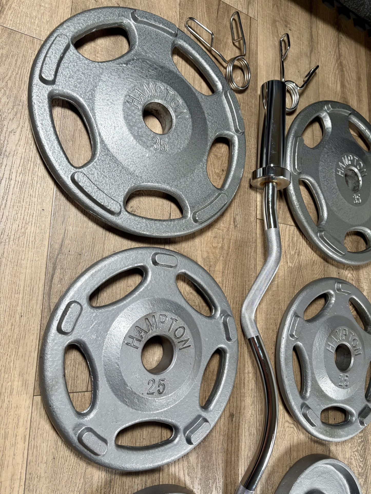 Olympic Beautiful Hampton Set & Brand NEW Curl Bar W/ Cooper Bearings: Pairs Of 35s, 25s, 10s, 5s and 2.5s ( Total: 175 lbs)
