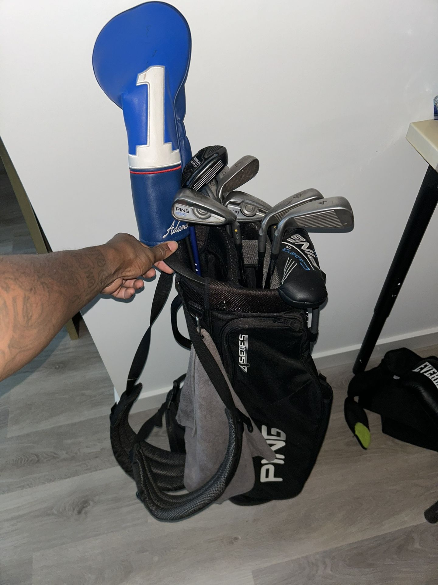 Complete golf setup including PING Hoofer 4 stand bag and a mixed set of clubs. Perfect for beginners or casual players. Includes: • PING irons (4, 5, 6, 8, 9) • Adams hybrid • Additional wedge(s) • Headcovers included Lightweight PING stand bag with dual shoulder straps, working stand legs, and multiple storage pockets. Clubs are in good used condition with normal wear nothing broken or damaged. Great set to get started without paying retail prices