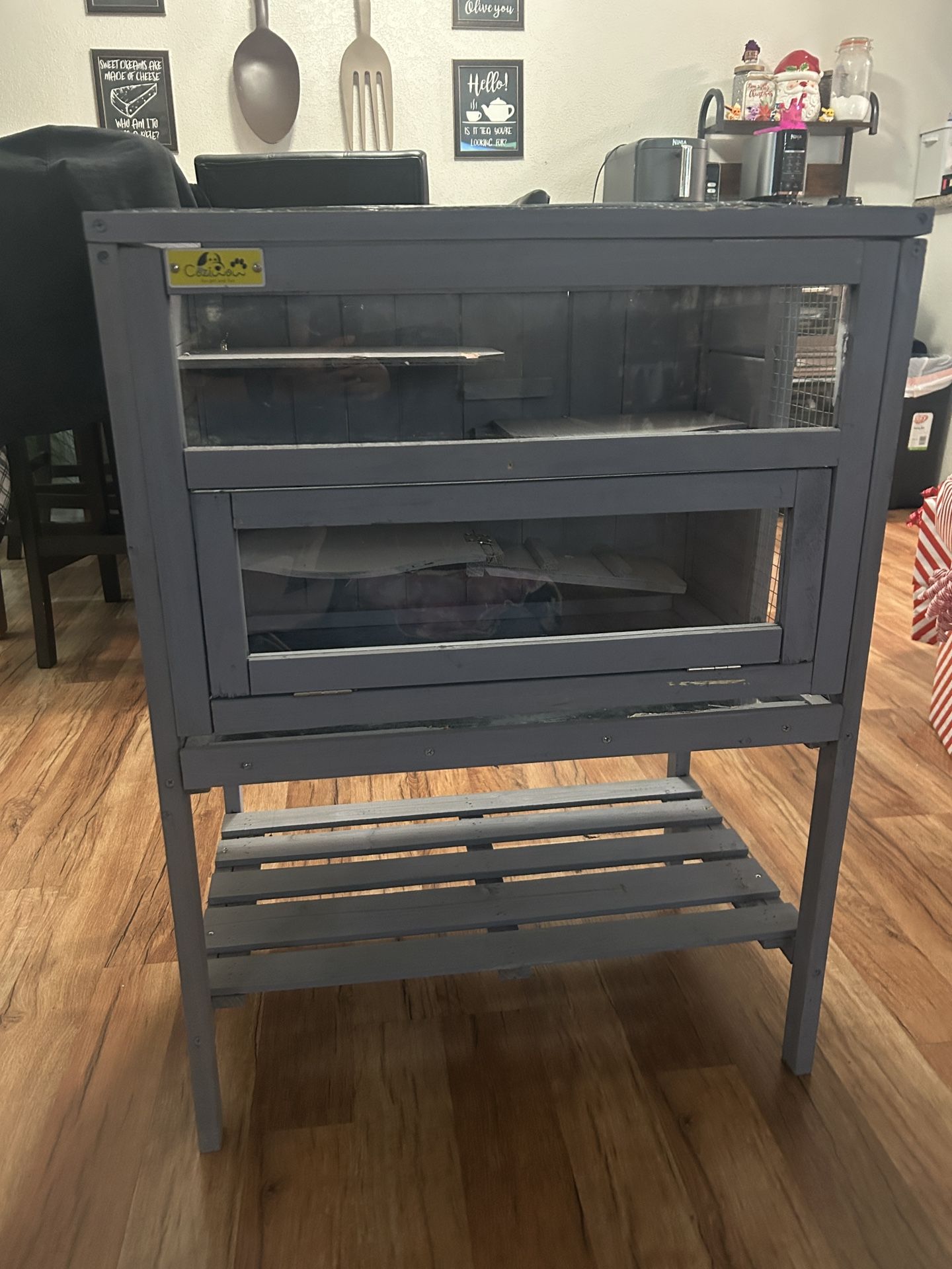 Large hamster cage for sale. The hamster cage is in decent condition with some scratches and chipped paint. Sorry, my hamster really liked to chew on the cage.