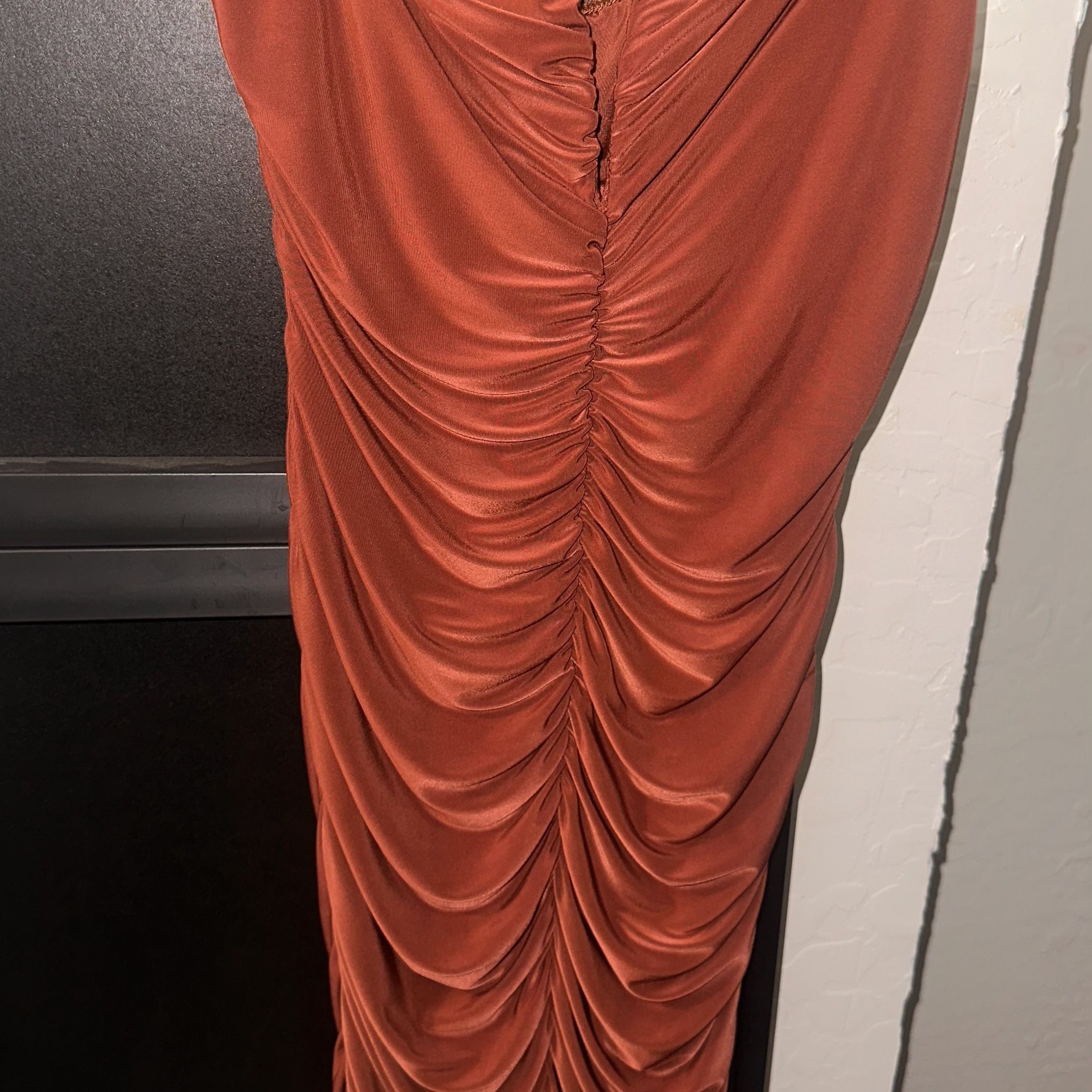 Formal dress in rust/terracotta color with elegant ruched detailing along the entire length. Features gathered fabric design creating dramatic draping effect.