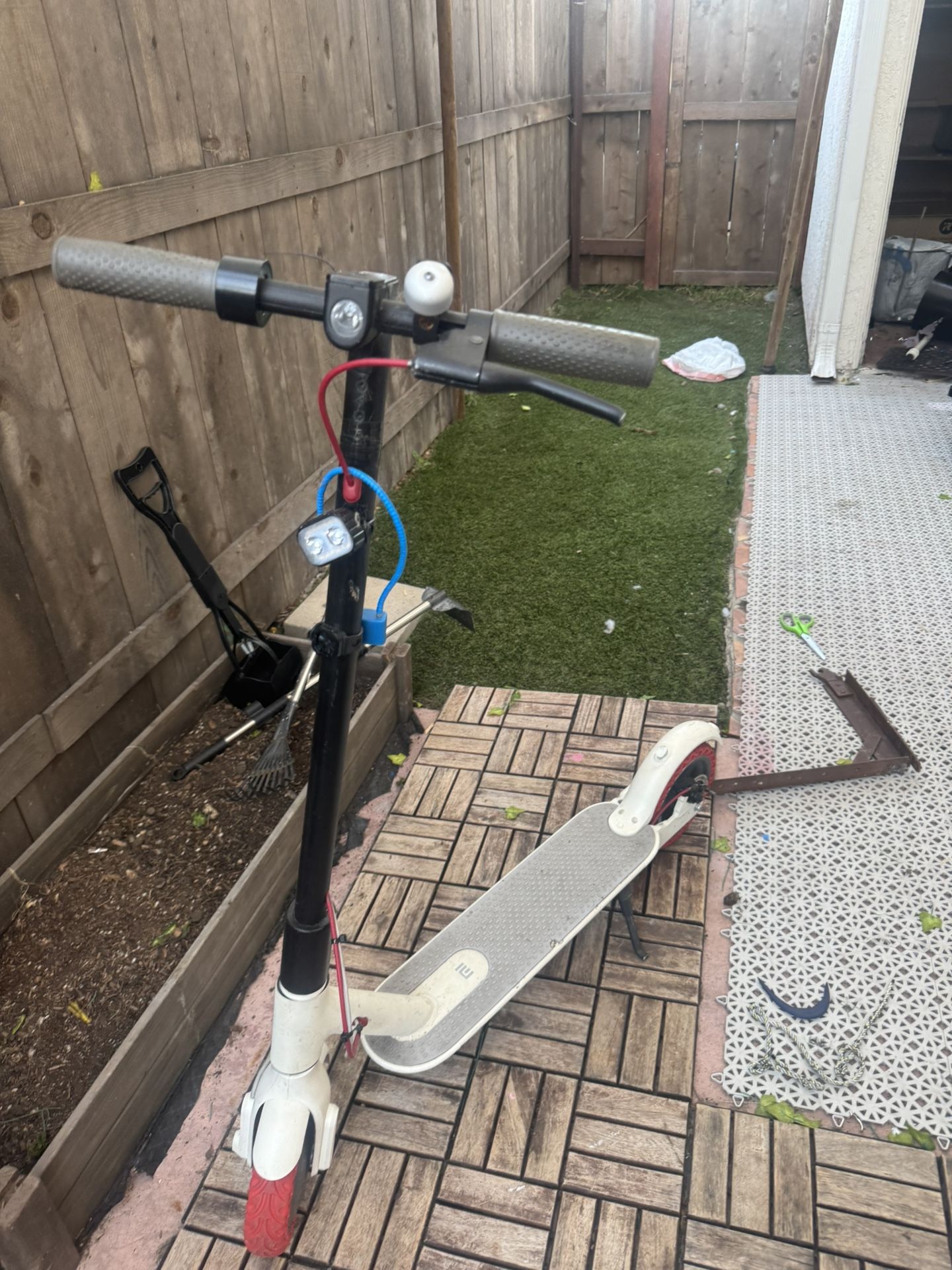 Xiaomi M365 electric scooter - aftermarket red hard wheels - everything runs fine but the power button on the board has to be pressed with a paper clip to turn it on. If you want it to work brand new again, a replacement board is cheap ($20 Amazon) and super easy to install (literally one cable plug and play). Aftermarket hard rubber wheels, doesn’t use any air so you’ll never have to worry about a flat. This model doesn’t fold, however you can buy the folding mechanism for 30 bucks online. Goes up to 15 mph Priced to sell!!