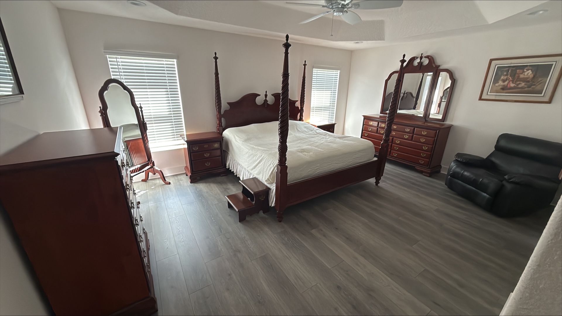 Includes king size bed, 2 nightstands, a tall dresser and a long dresser with a mirror All used but like new