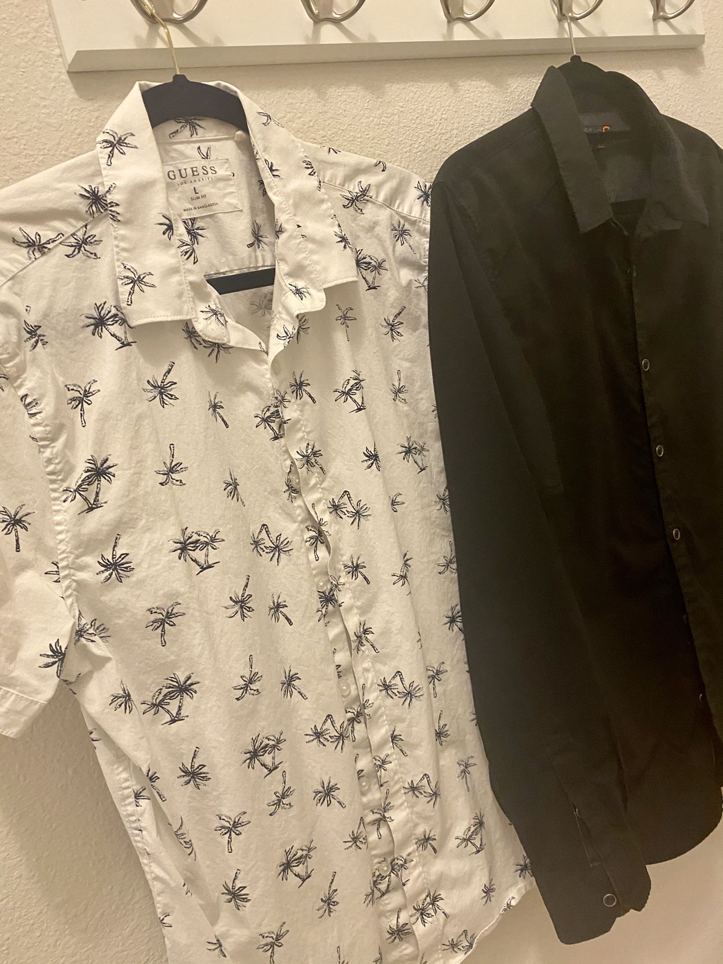 Two button down shirts. All black ( G by Guess) and palm tree print. Both size large.
