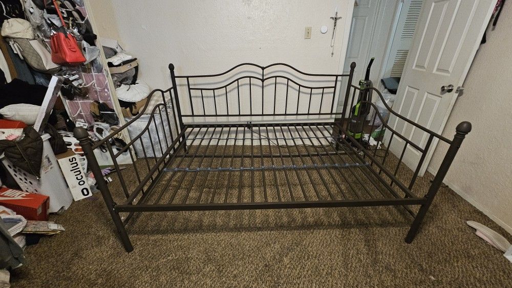 Queen-size metal bed frame, only a minor cosmetic detail, it doesn't affect its function at all. The mattress is included with the purchase of the frame.