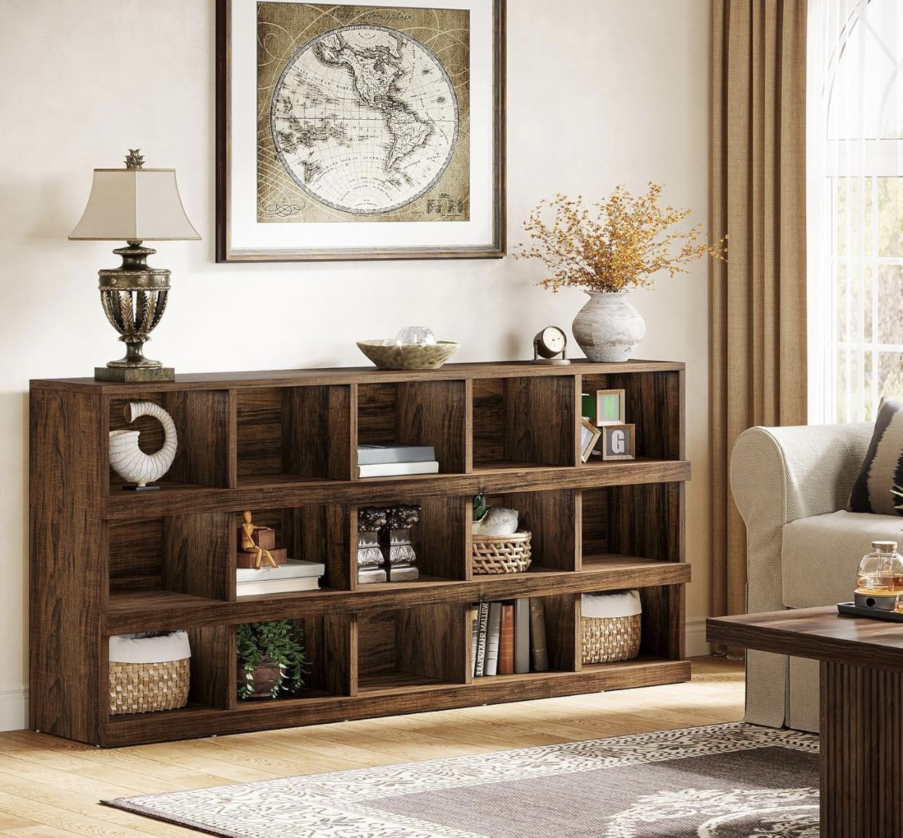 JW0891 63-Inch Farmhouse Console Table, 15-Cube Narrow Entryway Table, 4-Tier Wood Behind Couch Sofa Table, All Wood Hallway Table with Storage for En