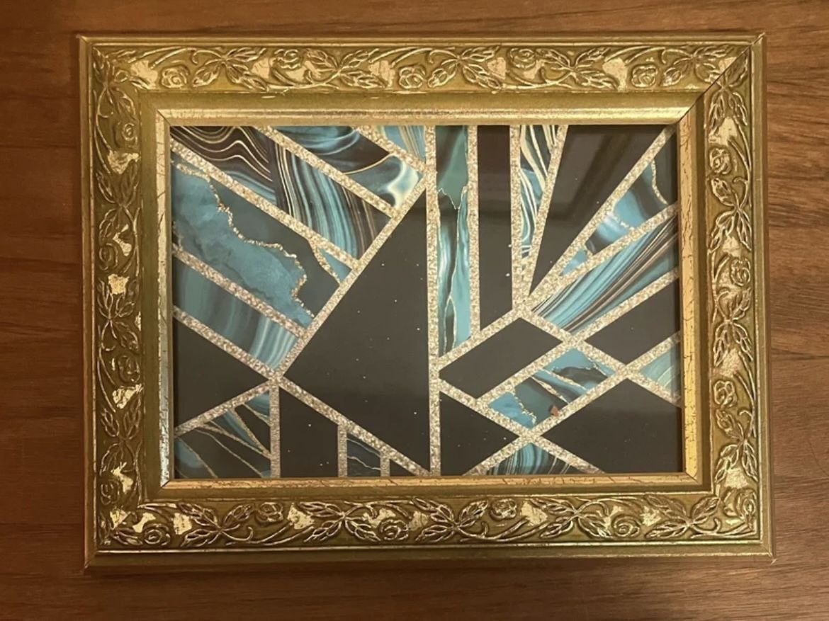 Handmade Mid Century Modern Abstract Design Vanity Tray Made With Vintage Frame. Digital design in teal, black, & gold. Bottom is sealed with cork to prevent scratching & again with red velvet for aesthetics.