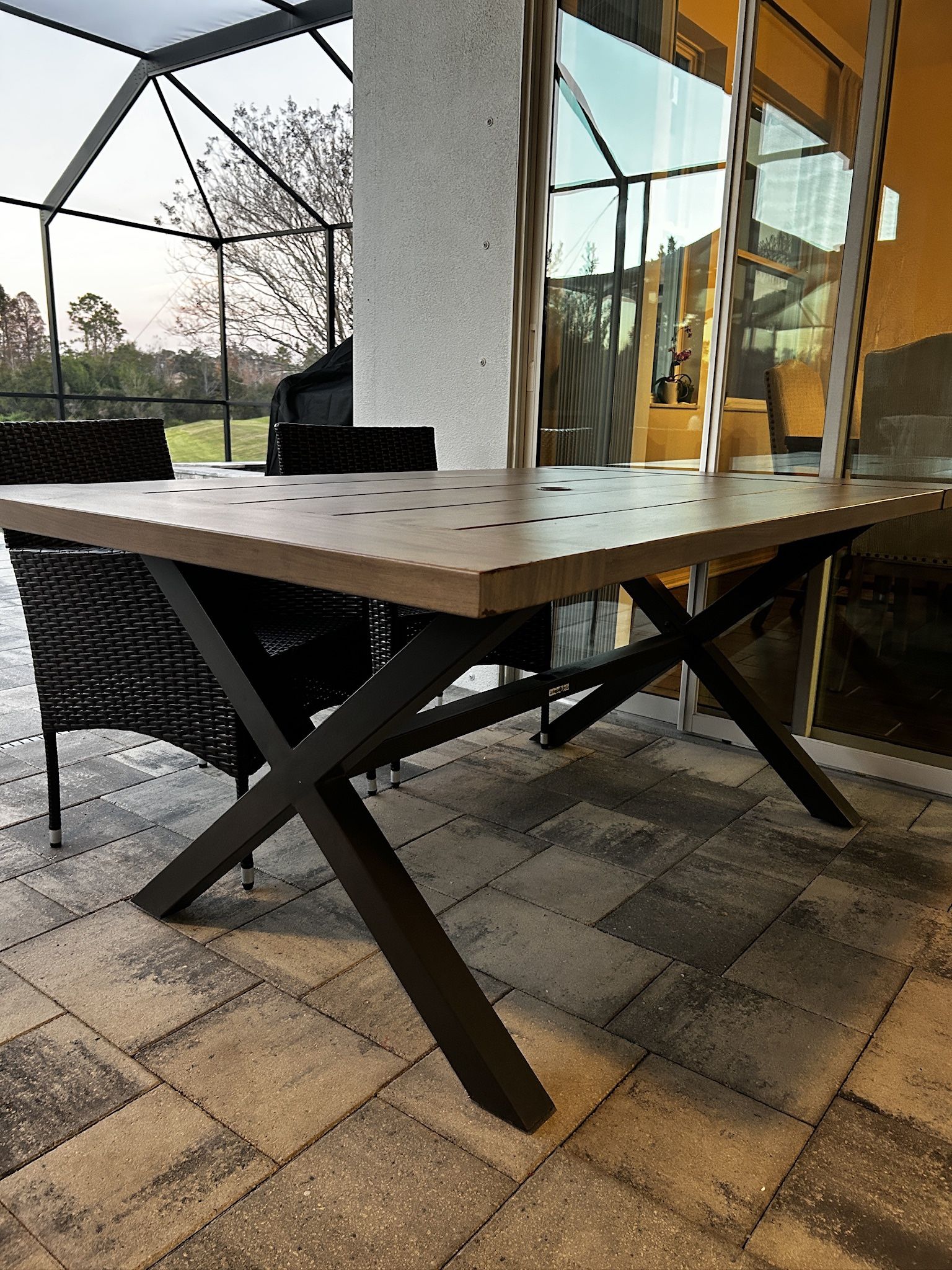 Good condition and sturdy table. Can place an umbrella in middle. Width 39 Length 67 Height 28
