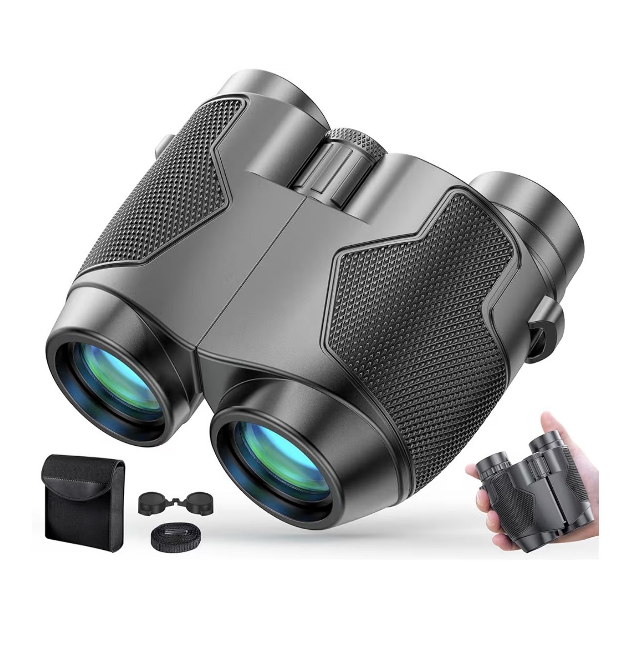 I have 2 ๐ฆใ๐๐ง๐ก๐๐ง๐๐๐ ๐๐ข๐ฌ๐ข๐จ๐ง ๐๐๐ฑ๐๐ ๐๐ข๐ง๐จ๐๐ฎ๐ฅ๐๐ซ๐ฌใThese premium binoculars offer 12X magnification with 25mm objective lenses, presenting a 1000M expansive field of view that captures sharp and vibrant images without distortion or color shift. Ideal for wildlife observation, you can effortlessly spot birds in your garden or scan the forest for animals and vegetation in a single sweep. Their performance is also exceptional for watching sports games and enjoying live music performances. ๐ฆใ๐๐๐ฑ ๐๐ข๐ ๐ก-๐๐จ๐ฐ๐๐ซ๐๐ ๐๐ข๐ง๐จ๐๐ฎ๐ฅ๐๐ซ๐ฌ: ๐๐ข๐ฌ๐๐จ๐ฏ๐๐ซ ๐๐๐ญ๐ฎ๐ซ๐'๐ฌ ๐๐๐๐ฎ๐ญ๐ฒใElevate your outdoor adventures with these 12x high-powered binoculars. Perfect for binoculars for adults and binoculars for kids, these professional binoculars bring faraway scenes closer with razor-sharp clarity. Whether bird watching, hiking, or exploring, unlock the beauty of nature with visuals that traditional 10x binoculars can't deliver. ๐ฆใ๐๐จ๐ฆ๐๐จ๐ซ๐ญ๐๐๐ฅ๐ ๐๐ฒ๐๐๐ฎ๐ฉ ๐๐๐ฌ๐ข๐ ๐ง ๐๐จ๐ซ ๐๐จ๐ง๐ ๐๐ฌ๐ใEnjoy hours of comfortable viewing with the adjustable eyecups, designed to accommodate users with or without glasses. These binoculars for adults and binoculars for kids feature twist-up eyecups that provide a customized fit, ensuring a comfortable and immersive viewing experience whether bird watching, hunting, or exploring the outdoors. ๐ฆใ๐๐จ๐ฐ ๐๐ข๐ ๐ก๐ญ ๐๐ข๐ฌ๐ข๐จ๐ง ๐๐ข๐ง๐จ๐๐ฎ๐ฅ๐๐ซ๐ฌ ๐๐จ๐ซ ๐๐ฎ๐ง๐ญ๐ข๐ง๐ ใใDesigned for optimal performance in low-light conditions, the 12x25 binoculars are equipped with 25mm objective lenses, BAK4 prisms, and fully multi-coated optics. Whether you're using them as binoculars for hunting at dawn or bird watching at dusk, enjoy brighter and sharper images in any lighting scenario. ๐ฆใ๐๐จ๐ฆ๐ฉ๐๐๐ญ ๐๐๐ฌ๐ข๐ ๐ง ๐ฐ๐ข๐ญ๐ก ๐๐จ๐ฆ๐ฉ๐ซ๐๐ก๐๐ง๐ฌ๐ข๐ฏ๐ ๐๐๐๐๐ฌ๐ฌ๐จ๐ซ๐ข๐๐ฌใThese portable binoculars are designed to fold compactly, making them easy to slip into a pocket or bag, and they weigh a mere 0.7lb, perfect for on-the-go convenience. Suitable for both children aged 8-12 and adults, this package includes 1 HD Binocular, 1 Carrying Bag, 1 Cleaning Cloth, 1 Lens Caps, and 1 User Manual. Each pair of binoculars undergoes a rigorous 100% quality control test before shipping.