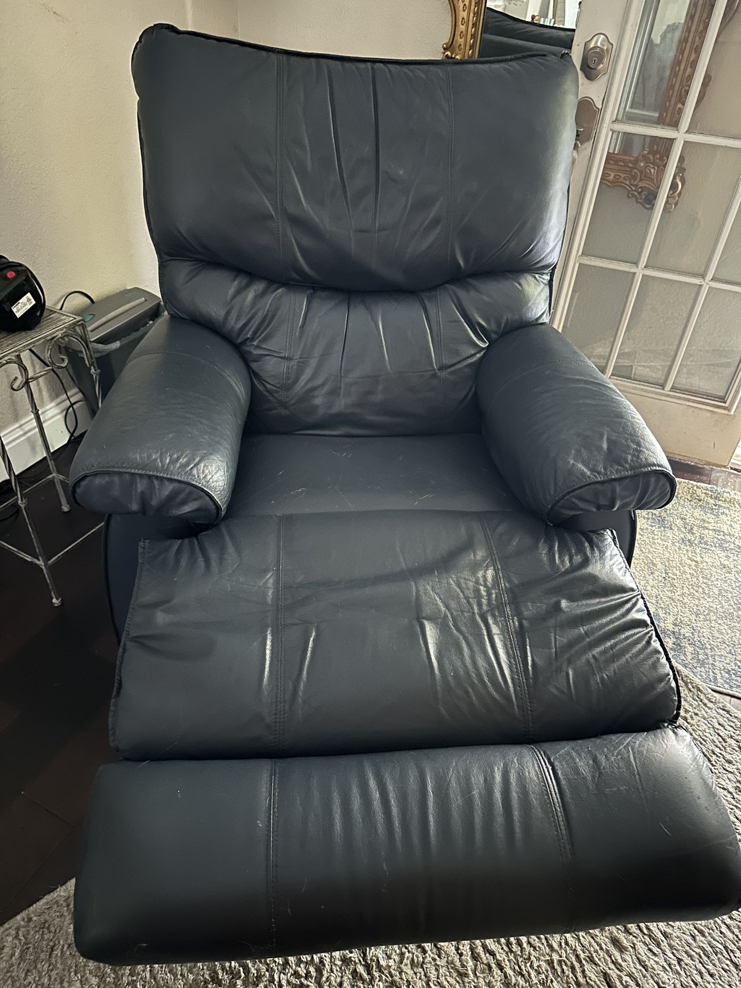 Blue Faux Leather Recliner 3 ft x 3 ft Has a few scratches in the seat