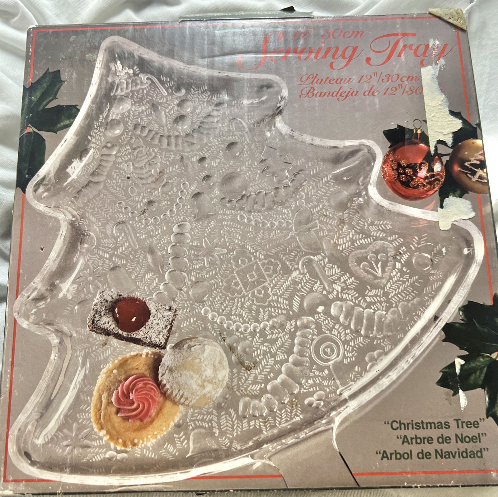 ***NEW*** open for pictures Add a festive touch to your holiday table with this vintage/retro Indiana Glass platter in the shape of a Christmas tree in the original box. The clear glass material beautifully reflects light, while the dimensions of 13 1/2 inches by 12 inches provide ample space for your favorite holiday dishes. Perfect for Christmas dinner or any other seasonal occasion, this tray will surely impress your guests. The intricate details of the tree design and the 1 1/4 inch height make this tray an elegant addition to any table décor. Get into the holiday spirit with this beautiful Indiana Glass serving tray. Please look at our pictures. 1 Piece Total 1 Plate approx. 12" long